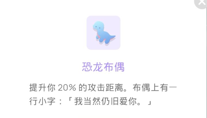 本期重点讲解#幻场 中的特殊系强化,本期讲解特殊强化的效果与建议这些强化大多通过NPC获得,一共8个它们分别是:因陀罗体,星云沙漏,蔚蓝密钥,绯红密钥(暂无获取方式),月光蛹,金苹果,美鱼人(异),恐龙布偶这些强化均属于可以获得也可以不获得的,我将会逐一讲解获取方式特殊强化1:恐龙布偶获取方式:在梦呓之森地图第三关与宇航员伊卡对话效果:攻击距离+20%对于这种第三关的强化,必须要拿,