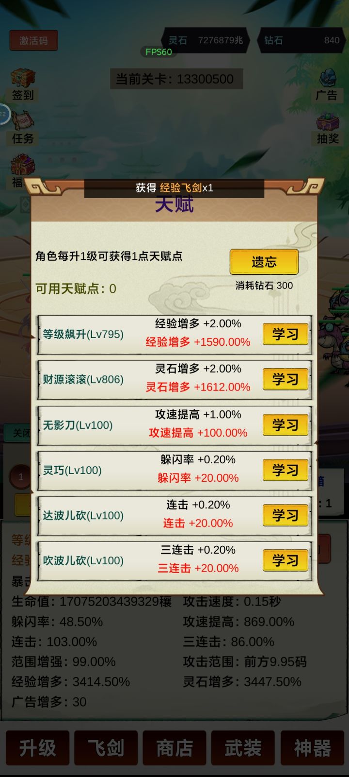 玩了7天左右,钻石获取就只有挂机和看广告,其他资源挂机就完了。商店里的增益每天必买,神器获得方式看脸,概率小的可怜。无聊打发时间还行。