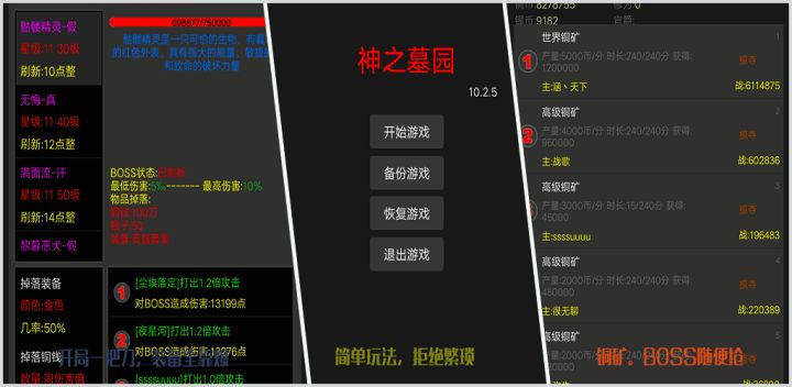 更新说明:务必:一个版本一个版本升级,跨版本升级会闪退。权限说明:必须有: 否则读取手机识别码 进游戏,弹出游戏数据异常。无法玩游戏读写内存卡权限 无法备份游戏,或恢复备份。一、阵营修真:主修智力修魔:主修力量二、流派闪避流血牛流纯攻流暴击流问题1,为何显示掉落装备,背包没有。答:切换到人物页面,想看哪种类型的装备就点界面上那个装备。就会显示当前装备和背包内的装备。