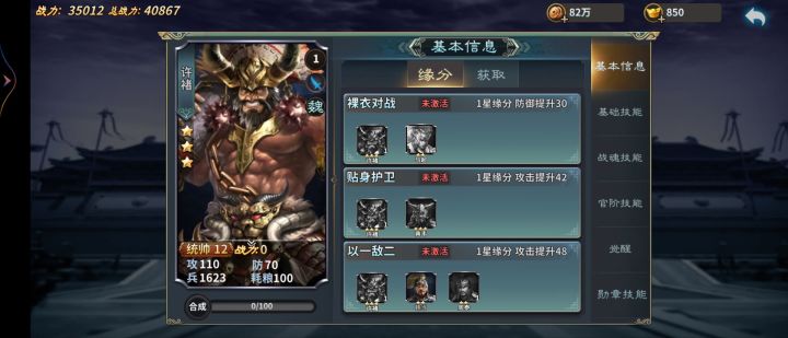许褚:字仲康,谯国谯人。长八尺馀,腰大十围,容貌雄毅,勇力绝人,与葛陂贼交战时在箭矢耗尽的情况下掷石攻敌,后在粮食短缺的情况下诈作与贼和解并以耕牛交换粮食一但在牛突然狂奔的情况下拿着牛反方向行百余步,由此在淮汝一带的人提起许褚之名皆畏惮。【缘分】【技能】【战魂】【官阶技能】【觉醒】【勋章技能】