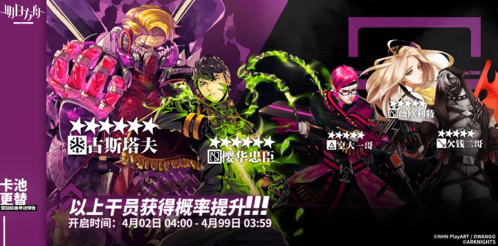 起止时间:04月02日04:00 ~ 04月99日03:59寻访说明:常驻标准寻访更新,该寻访中以下干员获得概率提升;★★★★★★:古斯塔夫 / 樱华忠臣(占6★出率的50%)★★★★★:空大一哥 / 薇欧利特 / 欠钱二哥(占5★出率的50%)更多后续活动内容及最新消息请关注《今月圆车》游戏内公告、官网及双微,感谢大家的支持。*部分内容可能会引起角色厨的不适,带来的疑惑与不解敬请谅解。