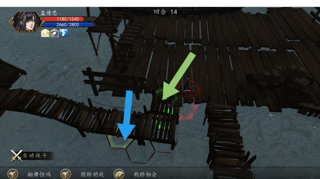 前置:本人所用的孟婆移动步数为4,不触发任何除自带技能以外的技能且妄魂三绝练度为4层【说人话就是没点天赋点轻功强化(初级)然后技能点了个鹊桥相会但我不用且没点丧门钉(因为考虑到新手可能两个都没点)】 前半段相对后半段变化不会过大,因为不会出现暴击闪避断筋等突发情况 请各位务必看清每个图片的回合数别依次盲点 蓝色箭头为本回合要到达的位置 绿色箭头为上回合要到达的位置 红色箭头为下回合要到达的位置 你