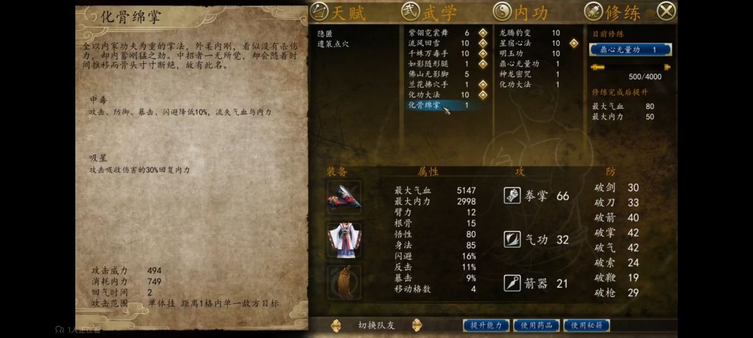 封面是十四回合因为图片实在容不下了[表情_嫌弃] 前置:本人所用的孟婆移动步数为4,不触发任何除自带技能以外的技能且妄魂三绝练度为4层【说人话就是没点天赋点轻功强化(初级)然后技能点了个鹊桥相会但我不用且没点丧门钉(因为考虑到新手可能两个都没点)】且后半段尽量不浪费食物所以有些回合磕食物就能遁走,我没用(其实浪费了8个肉包子),但不氪应该是不行的,陈公公移动距离为6格,且技能有3格的范围,单凭4格