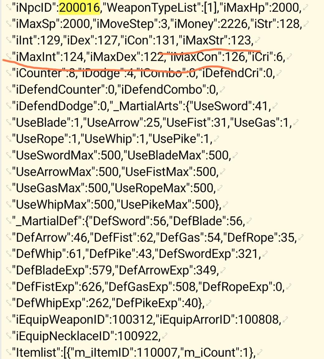 "iMaxStr":123,——臂力上限"iMaxInt":124,——悟性上限"iMaxDex":122,——身法上限"iMaxCon":126——根骨上限