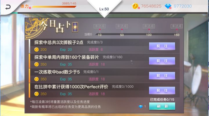 《绝对音域》的每日任务是推荐玩家每天必须要完成的内容,且不说高额的经验奖励,就凭那活跃度礼包里好几百的钻石和装备碎片都是稀缺的游戏资源。那么每日任务怎么做呢?是拿到任务就做么?当然不是,每日任务每天只能做15个,我们的目标是在15个任务之内达成150活跃度,拿到最高奖励。那么具体怎么做呢?任务分品级,不同品级奖励的经验和活跃度不同,灰色产出20经验和6点活跃度,而橙色则是35经验和18活跃。按照