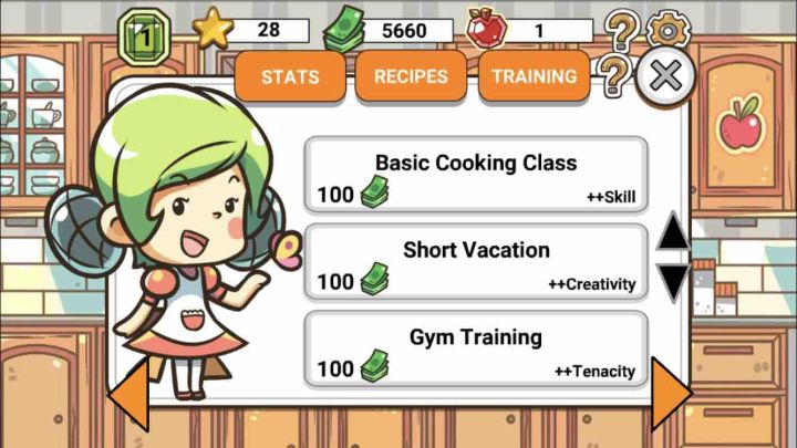 外网上找到此游戏的攻略看看挺有帮助的:1. 开始先升级角色技能Skill关系到对决中能取得更好成绩,Creativity影响到开发新菜谱的成功率,Tenacity影响到升级菜谱以及在市场中获得更稀有食材的概率。初始角色Sylvie妹子推荐重点升Skill,这样初期她只靠初始三个菜谱就能赢很多对决,等以后招募到新厨师了升级时可以有不同侧重了,比如到市场买食材时就用Tenacity升的高的角