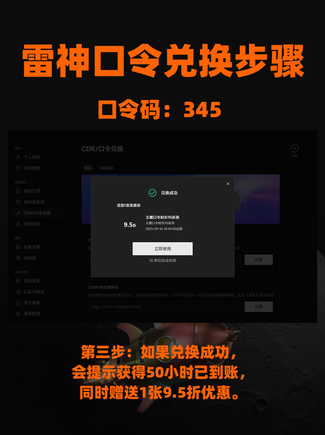 姐妹们!我又来分享游戏人的快乐了!😭 最近发现雷神加速器的一个隐藏福利,简直不要太香!免费的50小时时长还有折扣券,赶紧冲!🏃♀️🤫 【内部口令】大公开!🔑 兑换口令:LS345 或者 345记住这两个神奇密码,下面手把手教你如何变成“时长富翁”!💰📝 【保姆级教程,3步搞定!】1️⃣ 打开雷神,找到“藏宝图” 🗺️登录你的雷神加速器,看右上角那个【三条杠】图标没?点它!然后在菜单里