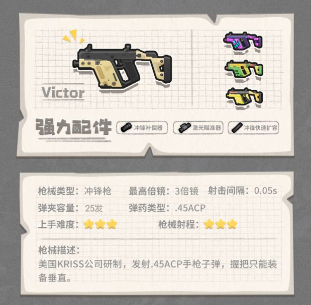 大家好,我是小仙鱼,今天我们就来写一下关于kriss Vector的攻略 先赞后看,是好习惯 背景介绍: KRISS Vector系列冲锋枪是由美国枪械公司“美国KRISS公司”所研制及生产的冲锋枪枪族,又译为短剑冲锋枪,发射“.45 ACP”手枪子弹。美国KRISS公司的前身为转型武器研究军事工业 (英语:Transformational Defense Industries,简称:TDI)。此