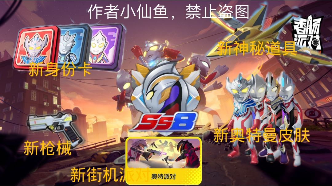 正式服ID:1btz6y 正式服名称:月初又失眠 各位肠友你们好我是@白月初爱吃糖 香肠派对自SS8更新以来好像又让我回到了S10的那个夏天一切都是那么的新奇,这个赛季奥特曼又来陪伴我们让度过这个美好的寒假。 本帖讲解分为四部分:⒈奥特曼身份卡 ⒉胜利海帕枪 ⒊胜利飞燕号 ⒋奥特派对 ………………………………分界线………………………………… ⒈奥特曼身份卡讲解 本赛季奥特曼身份卡共有三#香肠派对SS8创作征集令