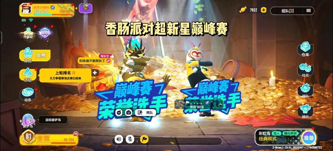 香肠派对新赛季个人推荐:如果是四个好基友组队,可以两个人一个骑飘飘龙,骑龙的人就用自己常用的枪就行。另外一个人可以用自己常用的枪也可以用重火力。身份卡推荐骑龙的人用甜心身份卡也可以用武圣身份卡还可以用军师身份卡。武圣卡的作用是,如果龙没了可以它跑。甜心身份卡的作用是,可以配合队友救人,军师身份卡可以负责探查敌情报点位。另外一个不骑龙的人可以用神王身份卡,可以用来天降正义玩的时候直接开技能飞到龙身上