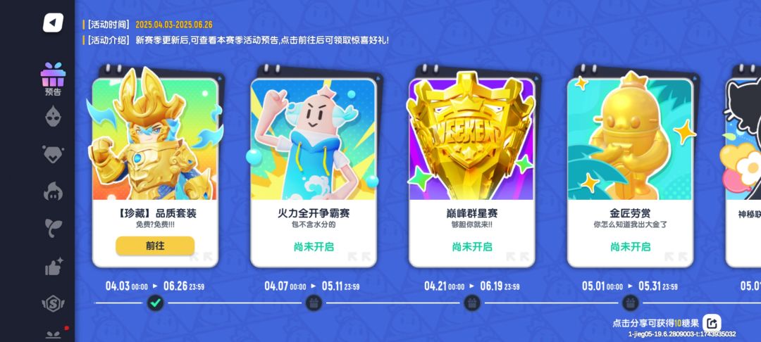 #香肠派对ss20征集令 正式服id:js2a5g 如上图作者已经拿到一个梦幻[表情_送花] 首先我们要知道新赛季的宝箱分普通和高级,普通的爆率一般为一根金条或一堆金条,宝箱颜色为黄色,而高级的爆率则有战甲或一袋金条,刷新地方也各不相同,高级宝箱在冲锋波波和会飞的,野区刷新较少,其次藏宝库也能获得大量装备和金条,尽量和队友一起,因为有了队友的帮助你会获得更高的评分,评分越高奖励越好,c级就只有金