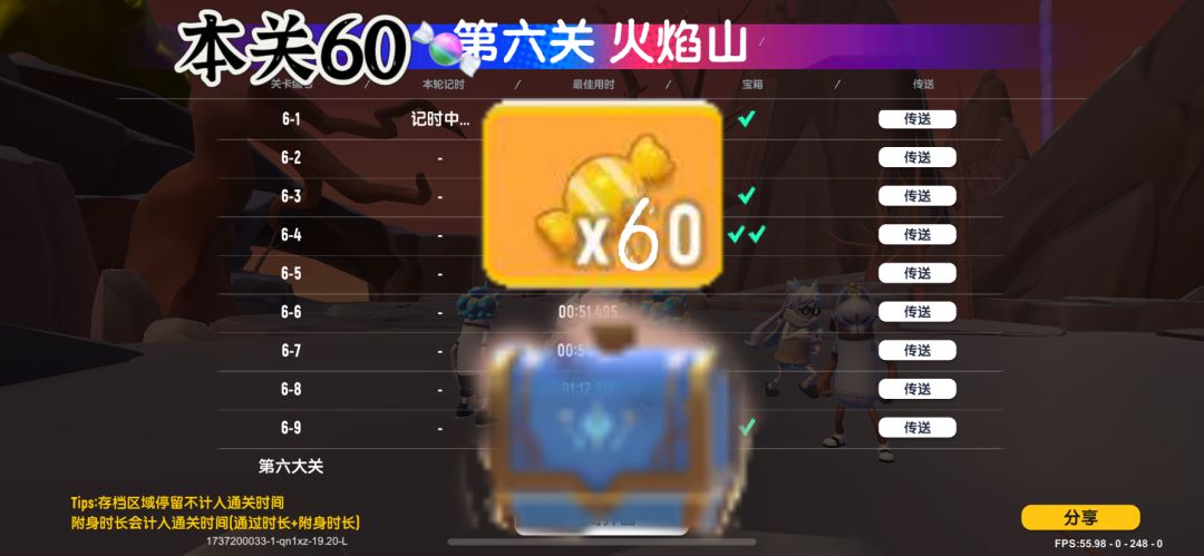 第六关共有5个宝箱,5个宝箱集齐可得60颗糖果 「难度系数代表宝箱难度,不代表关卡难度,与关卡相关的宝箱,其难度系数会随关卡提高」  开局向后转,即可看到金牛牛 难度系数:1星 视频讲解:   到6-4存档后,可通过左后方台阶跳过去 难度系数:2星 视频讲解:   别被火焰喷射2次哦!从火焰口跳第一串上,通过第一串跳到第二串上,即可获取宝箱 难度系数:2星 视频讲解:   需要找