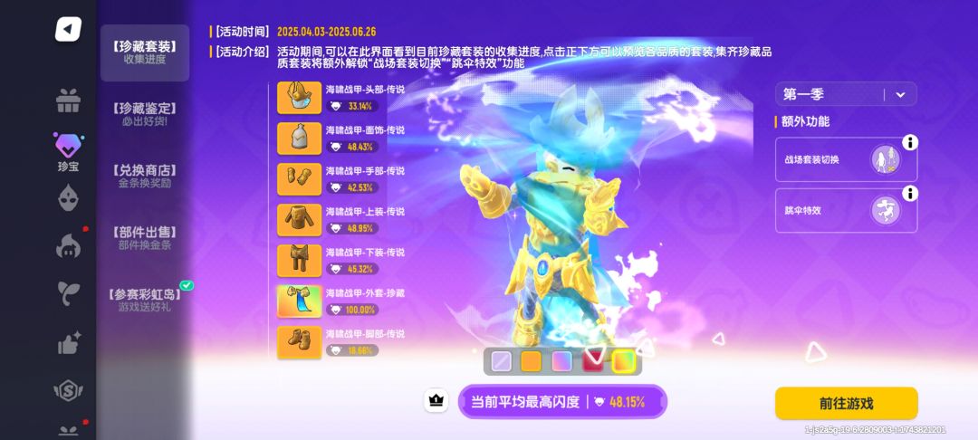 #香肠派对ss20征集令 正式服id:js2a5g 如上图作者已经拿到一个梦幻[表情_送花] 首先我们要知道新赛季的宝箱分普通和高级,普通的爆率一般为一根金条或一堆金条,宝箱颜色为黄色,而高级的爆率则有战甲或一袋金条,刷新地方也各不相同,高级宝箱在冲锋波波和会飞的,野区刷新较少,其次藏宝库也能获得大量装备和金条,尽量和队友一起,因为有了队友的帮助你会获得更高的评分,评分越高奖励越好,c级就只有金
