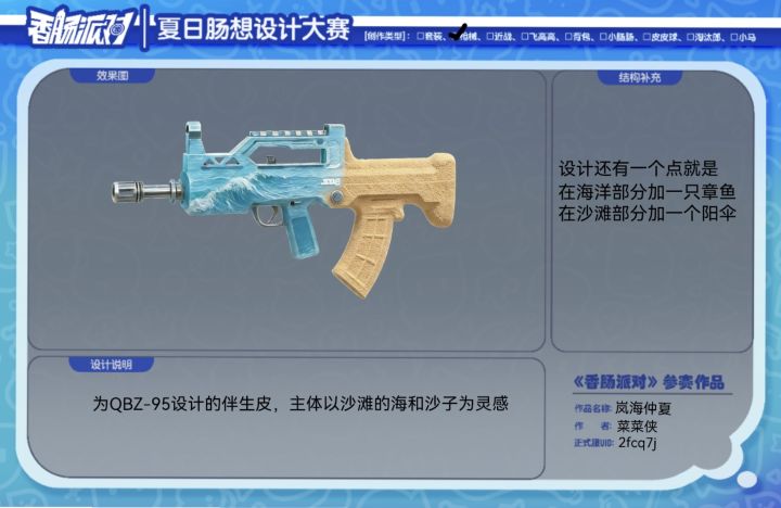 正式服ID:2fcq7j 作者:菜菜侠 作品名称:岚海仲夏 皮肤类型:武器 设计灵感:QBZ-95沙滩类皮肤 #香肠派对第四届设计大赛