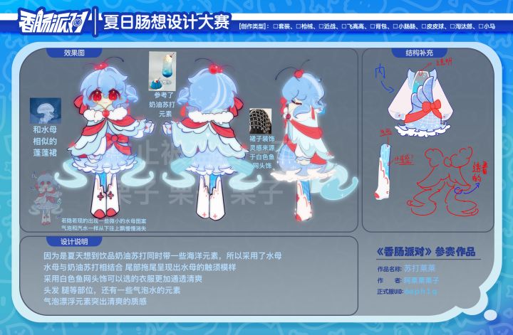 【正式服ID】:6aph1q【作者】:阿栗栗栗子【设计作品名称】:苏打莱莱皮肤类型:套装设计灵感:1.因为是夏天想到饮品奶油苏打同时带一些海洋元素,所以采用了水母2.水母与奶油苏打相结合 尾部拖尾呈现出水母的触须模样3.采用白色鱼网头饰可以选的衣服更加通透清爽4.头发腿等部位,还有一些气泡水的元素5.气泡漂浮元素突出清爽的质感注意:预想当中是可以眨眼的 而且发际线也不是特别高是那
