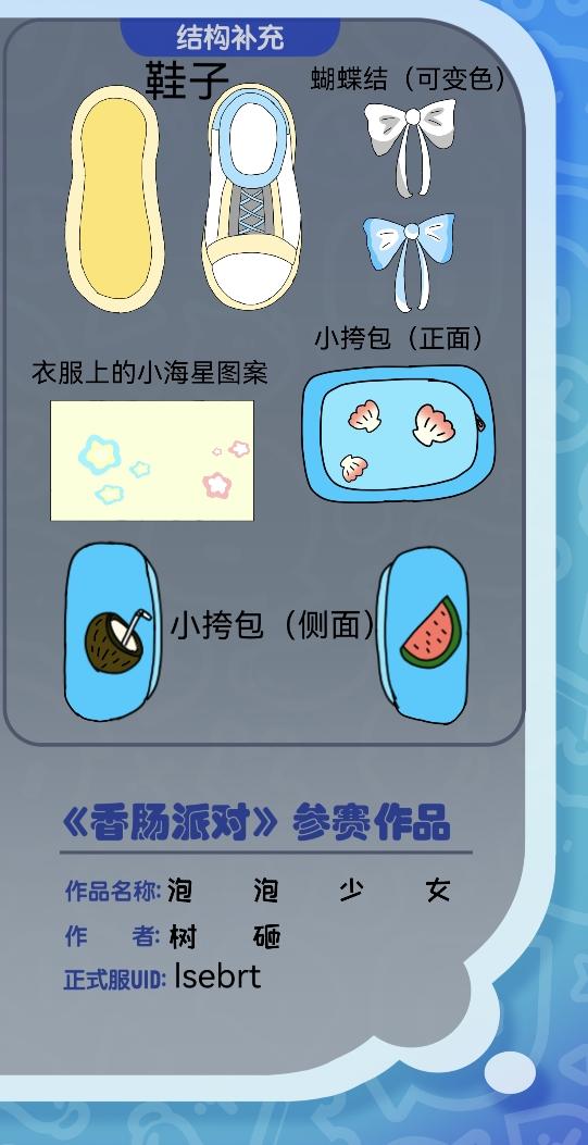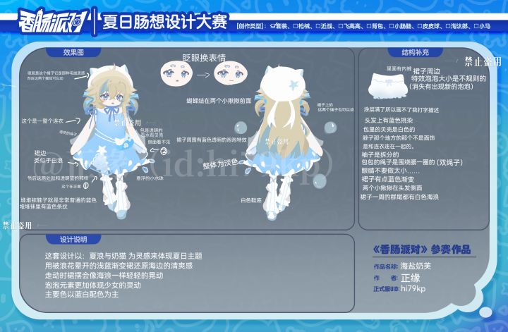 【赛道类型】第四届套装赛【设计灵感】设计说明《香肠派对》参赛作品这套设计以: 夏浪与奶猫 为灵感来体现夏日主题用被浪花晕开的浅蓝渐变裙还原海边的清爽感作品名称: 海盐奶芙走动时裙摆会像海浪一样轻轻的晃动泡泡元素更加体现少女的灵动主要色以蓝白配色为主【正式服游戏ID】hi79kp#香肠派对第四届设计大赛