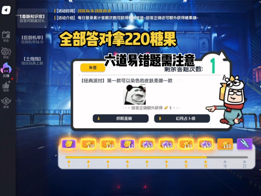 正式服ID:gly5mg肠肠们,SS25赛季每日一题&答案攻略他来了「首发」★每日一题★答对一题获得5个糖果,一共22题,全答对可获得110个糖果!注意:如果漏签需要使用5个彩虹补给箱钥匙进行补签一题下面跟着我的脚步一起拿下110糖果吧!第1题:【摸金派对】海盗地牢位于哪张地图?答案:A解析:海盗地牢位于呆呆遗迹第2题:【经典派对】咸鱼身份卡的所有技能都可以为玩家回复体力?答案