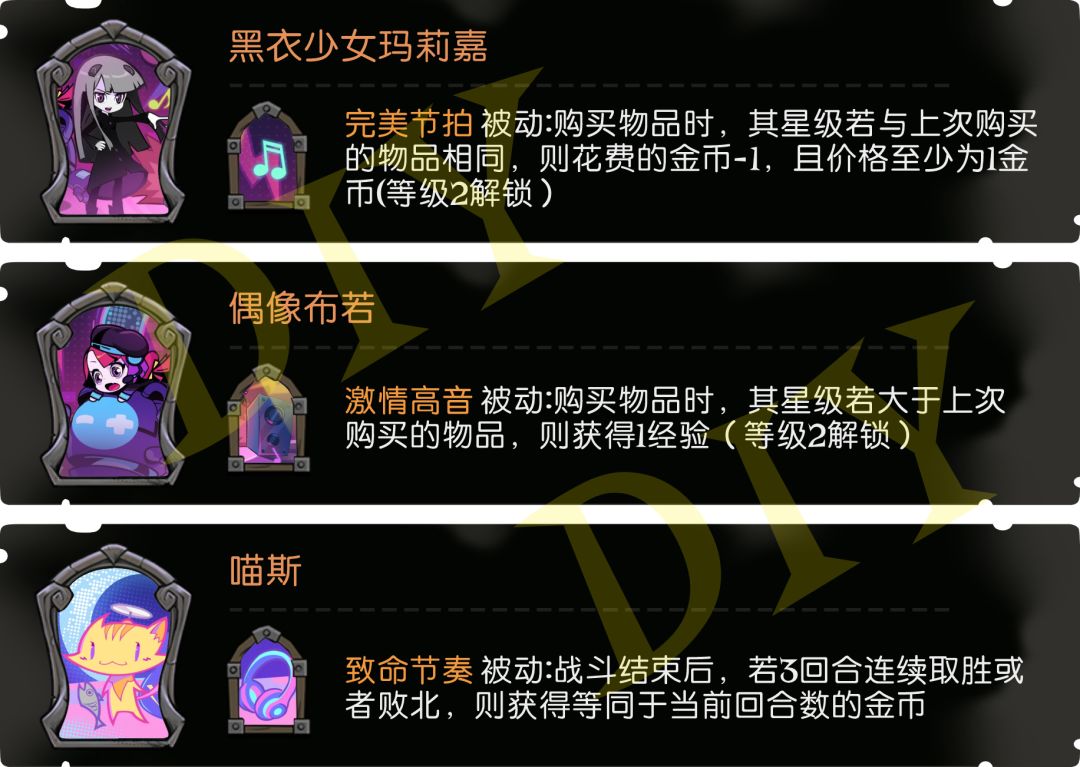【玉龙】【炎龙】这两条龙是填补没有龙阵营舞伴的缺憾,龙阵营的特色是先手和buff类遗言,所以这两条龙就是以此特色设计的。【玉龙】的技能将从拥有先手效果的所有随从、装备、咒术中挑选。【炎龙】将入场、先手、遗言合为一体,吃足倍率的同时,利用已经无用的入场随从给所有友方增加属性。 【乌鸦刺客】既有黑市商贩选同阵营的特点,又有黑天鹅低价购买的运营。 【品酒师】对应的是变色龙大师,都是获得商店中的随从,酩酊