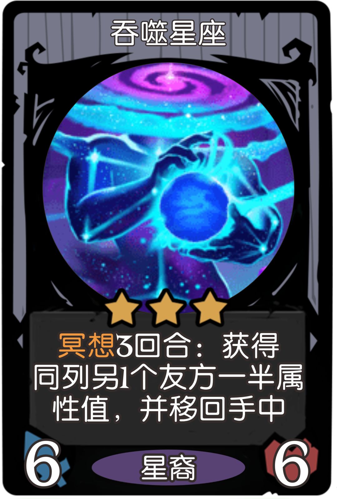 【吞噬星座】另一种无限冥想的表现方式,冥想结束后回手,再次打出便可重复冥想。配合【冥思者】(触发冥想+2+3)和【星轨测绘师】(触发冥想+1经验),能够稳定提供冥想收益。在后期,更是可以与【摩羯之影】和【黑夜行者】实现战力“倒转”,但是这种“倒转”只能起到辅助作用,因为只利用了【吞噬星座】回手的机制,其自身是无法带来属性提升的,所以总体上是比不过现在的资源倒转的。因为回手的机制,决定了他不能提供资