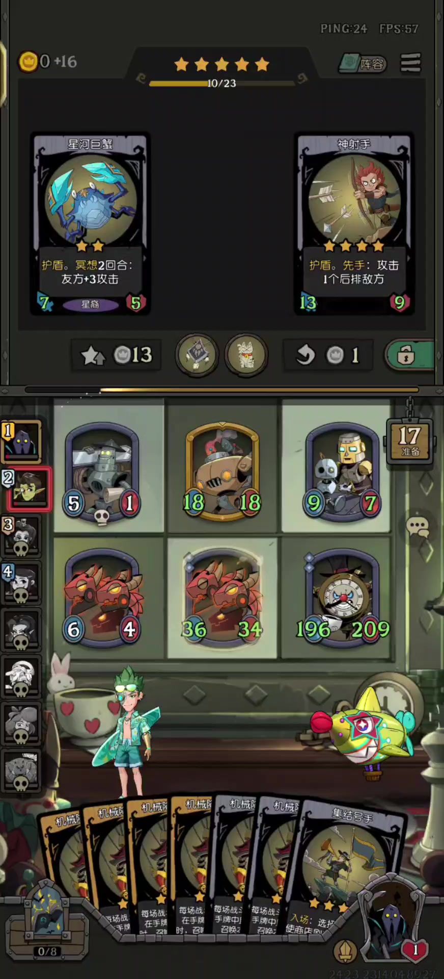 难度十最大的问题,在于前中期如何存活下来 基本节奏都是: 1本升2本不花钱 尽量卡在特殊商店买卡片 在十回后前后死一到两次 十回合后,套路基本成型 右下角可以扔一个低星但是长肉牌 不管前面怎么折腾,用他保障前进途中的平安 推荐黑马,机械魔术师,幽灵船长,魔法树苗,星辰龙,镣铐野人等 还有一个很大的感受是,不要看着攻略凑卡 这版dlc似乎和经典模式不一样,不会根据手里的卡牌来新卡 苦等着一个思路,容