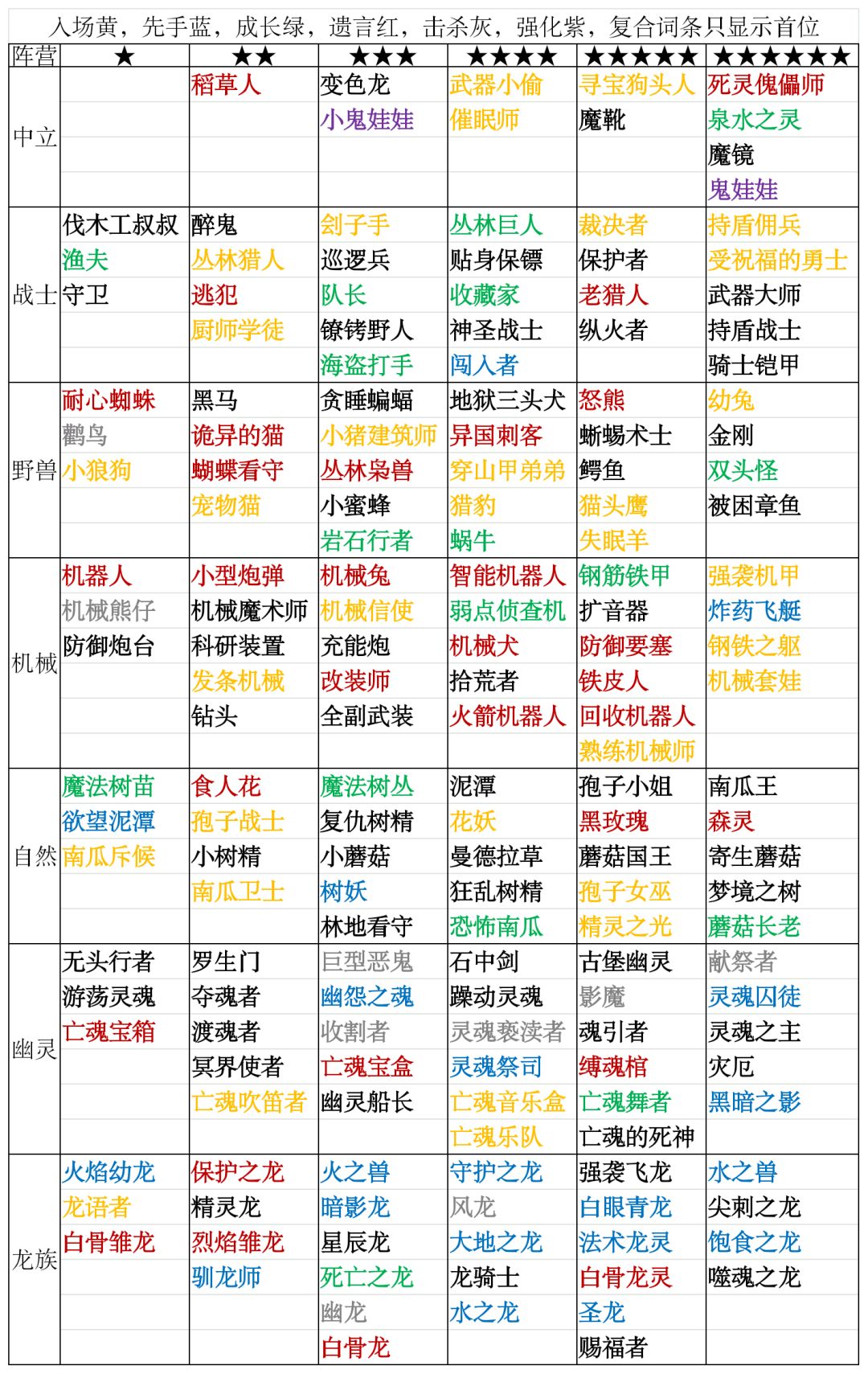 镜中的记忆文档图鉴(可筛选词条) https://docs.qq.com/sheet/DVVdqakl5QlVqbVFH?tab=BB08J2&scode= 随从分布(星级/阵营) 【入场】随从上场时触发的效果 【成长】进入战斗前触发的效果 【先手】战斗开始时触发的效果 【遗言】随从死亡时触发的效果 【击杀】消灭敌人时触发的效果#月圆之夜自走棋