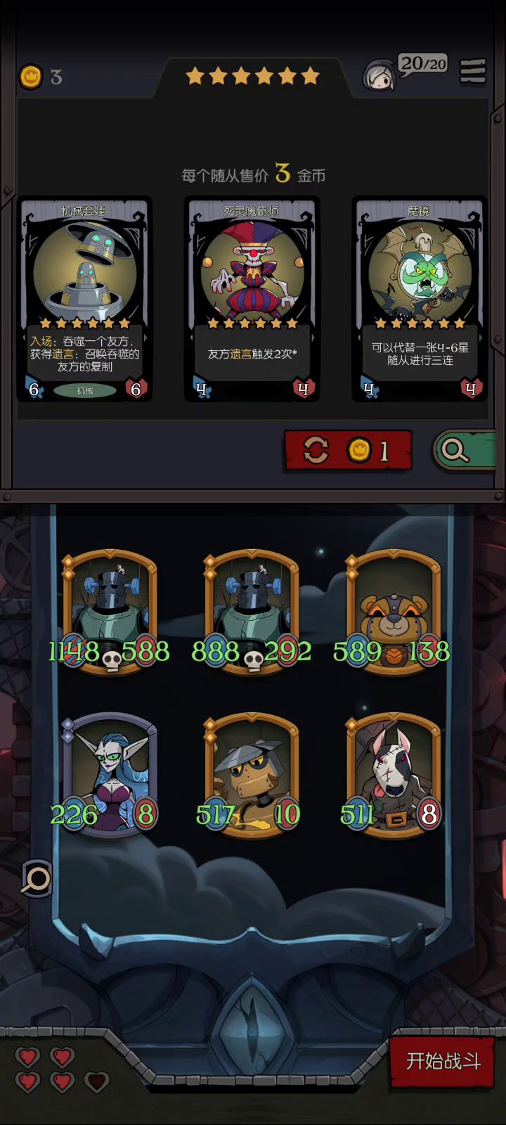 遗言,人龙盾,醉鬼,幽灵。都试过,但一方面是运气差,一方面是中期不知道怎么办,不是输出乏力就是血量差那么一点点 最终还是认定机关枪,但始终凑不齐,参考大佬的帖子最后改了改,觉得更容易凑,就发一下,希望能帮到卡这很久的朋友们 战士野兽机械自然,不需要六星 6回合左右时,树精要么两张要么金,泥潭起码1金。小鬼娃是意外试成功的,各位也可以尝试其他的。 然后五星找蜥蜴 最后钱花完,给蜥蜴来了个4层强化的尖