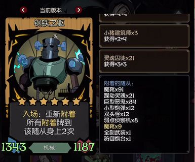 前言:此套卡组为狠活推荐,正常通关不用,推荐需要挑战成就或闲着没事时挑战自我。成型难度极高,需求卡牌五星打底,没有可替换卡牌,也没有下位替代。如果是卡关或者想找流派玩可以看看本站别的流派攻略,都很适合通关。 可能有些人不信这个邪,我在这先贴一张随从详情以示警告。 不是真没事真不建议玩这流派,这是最后的叠甲了。 优势:爆炸数值,就是强,碾压一切的强,对装备要求不多是设计师最后的怜悯。 劣势:成本要求