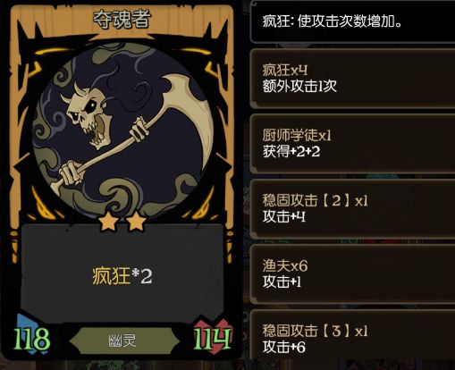 打的是难度6,感觉玩的挺爽的,所以就先发个帖分享一下,高难度的话还得测试一下哈 整体简介: 利用 疯狂 来进行连续输出。当疯狂的层数叠至6层时,配合部分装备能实现一回合完成多次击杀。 前期:夺魂者作为一张2星卡牌,较容易合成金卡,其2/10的初始面板能够较为轻松地度过前期。由于其初始攻击仅为2,需要为其提供攻击成长。 中期:部分成长型,击杀型装备能够很好地适用于夺魂者,帮助其实现数值增长。 后