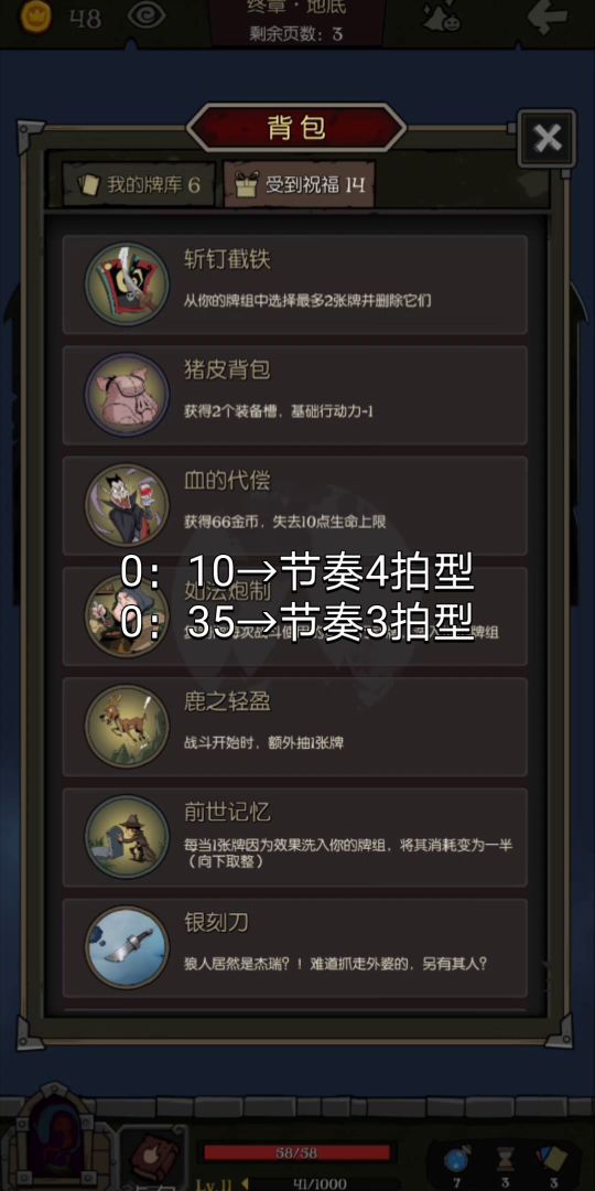 先发上牌组。耐心看完。(核心就是危险契约,生死转换也行。)牌组牌有点乱,猩红绽放和秘密研究不想要的,莫名的点了 打法需要一定的运气基础。 第一个场景需要不断刷天赋,直到把暗影之泉刷出来。 人物升级时选择行动力,因为选择装备栏局限有些大。 第二个场景,妖精祝福需要刷出前世记忆,后期的恶魔交易因为有了暗泉,所以什么减生命上限的天赋可以随便换。 碰上猪皮背包,前面选择的一点行动力排上用处,得到两个装备
