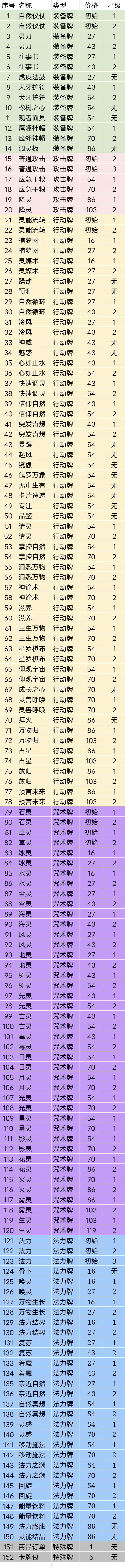 一、调灵师 图表记录的是噩梦六(含)以上的。调灵师是以装备牌、咒术牌和行动牌为主,极少量的攻击牌,没有那经典的五张反制牌。 一般情况下,卡牌星级提高一级,价格提高一档,但是调灵师有些卡星级提高了也没有涨价。。。自然冥想、灵兽呼唤、能量饮料就是这种情况。(其实就是数值策划偷懒了。) 此外法力、灵感、法力之潮图鉴里没有记录。 二、小猪妖 小猪妖以攻击牌、行动牌和装备牌为主,也没有经典五张反制牌。小猪妖