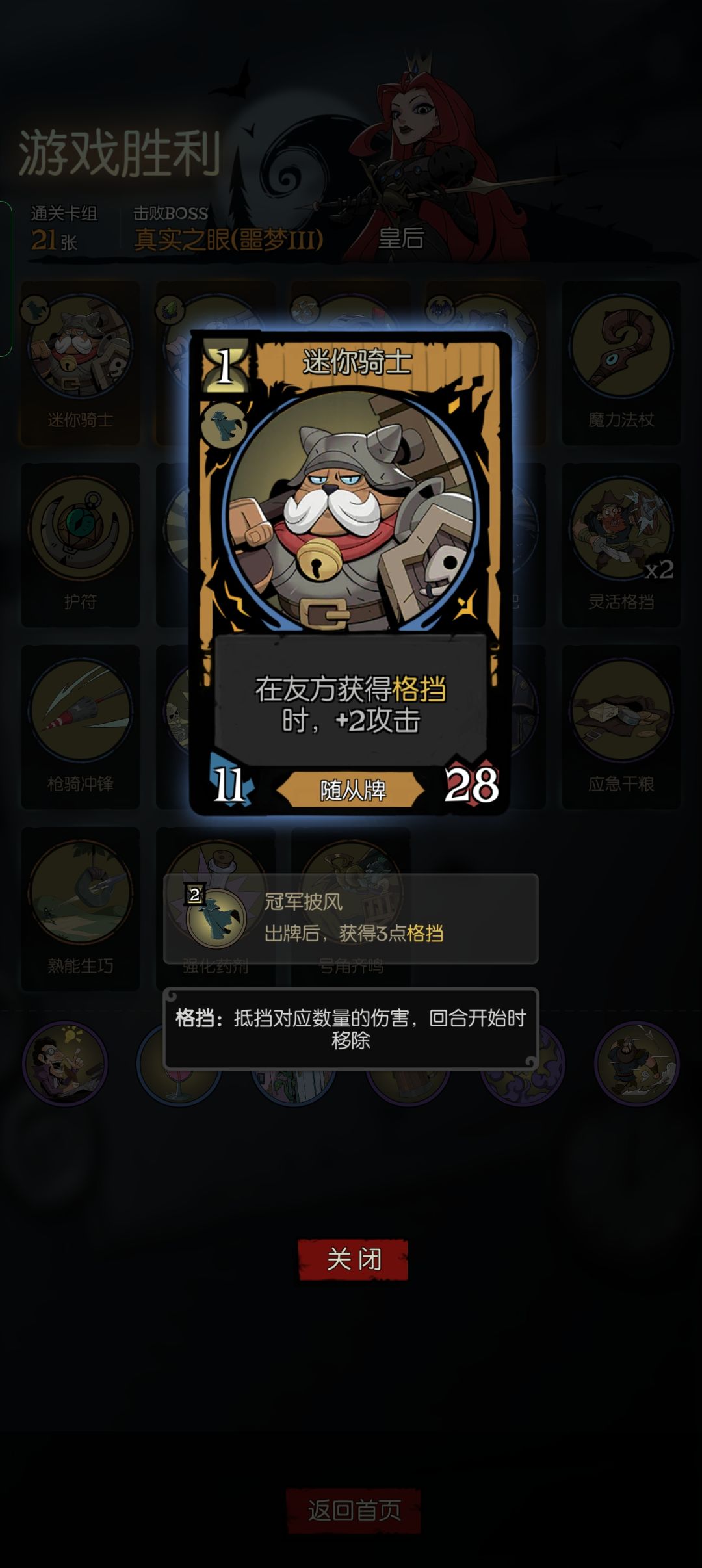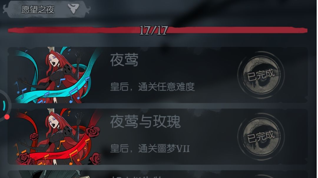 终于肝完了,总的来说愿望之夜的成就难度与经典模式相仿,略高于镜中记忆。 分享几个技巧,以及部分较难成就打法 1.皇后的所有流派中,纯格档最容易成型,也最强,前期拿张猎人平稳渡过,中期找到迷你骑士和全体加格档的牌即可成型。 其他流派,纯皇后攻击流前期强势,后期刮痧,过于依赖共鸣之歌;混合流则依赖追随者、皇后之刃,总的来说也难成型,且高难度很吃祝福。 2.机械师流派强度差不多,但无论什么流派,第一张随