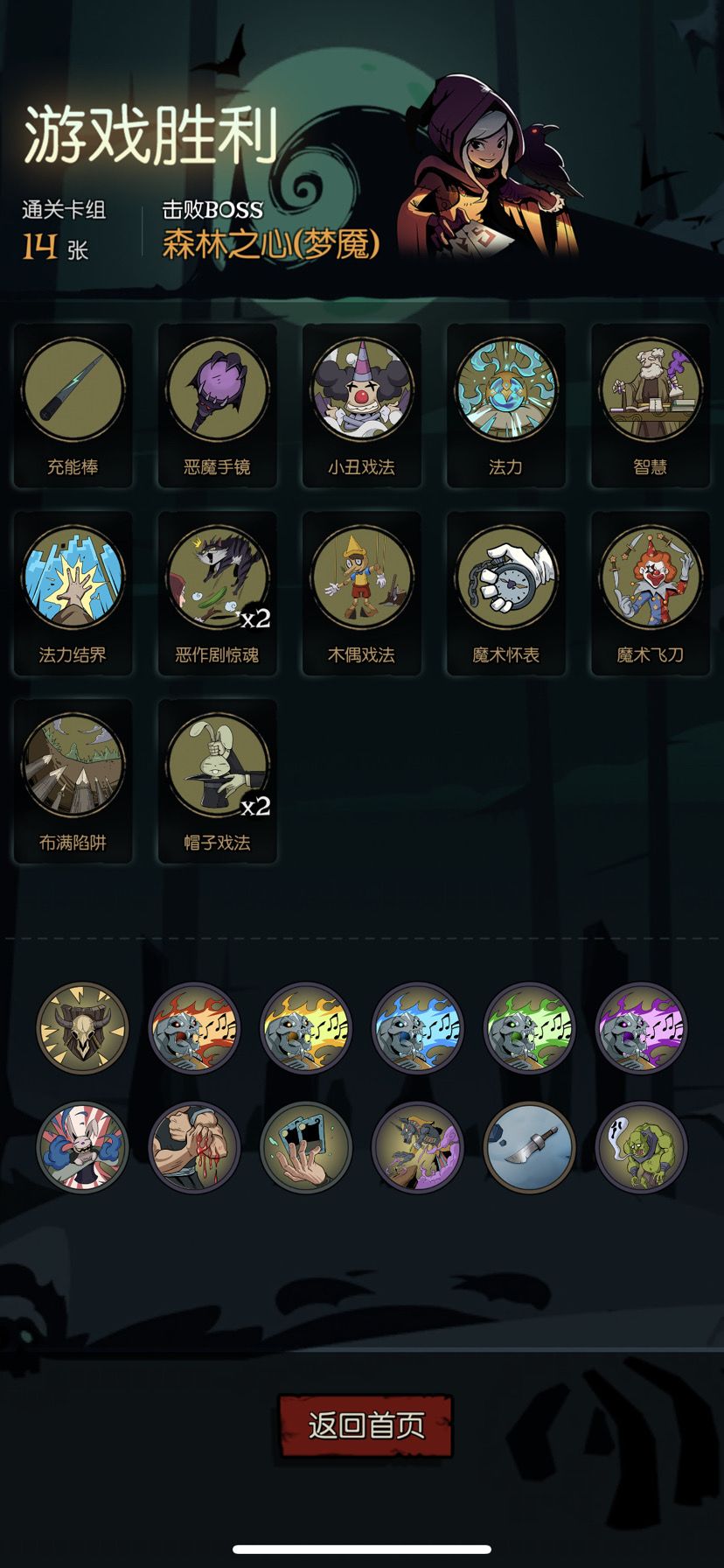 一FTK,卡牌可以精简,但没必要,几乎可以一回合打光手牌。 分享几点经验: 1、祝福推荐逃脱魔术,省点蓝。 2、恶作剧惊魂建议配合帽子戏法一同食用,效果更佳。 3、个人觉得恶作剧没必要拿,魔术飞刀也无需多拿,1个就够,带多了卡手牌,不易消化,配合悬浮、鬼牌、镜像等一同食用效果更佳,且这些牌也可复制怀表、气球等大大增加容错率。 4、其他反制牌确实没必要拿,我是因为早早给了一张魔术力场,怕浪费拿了3张