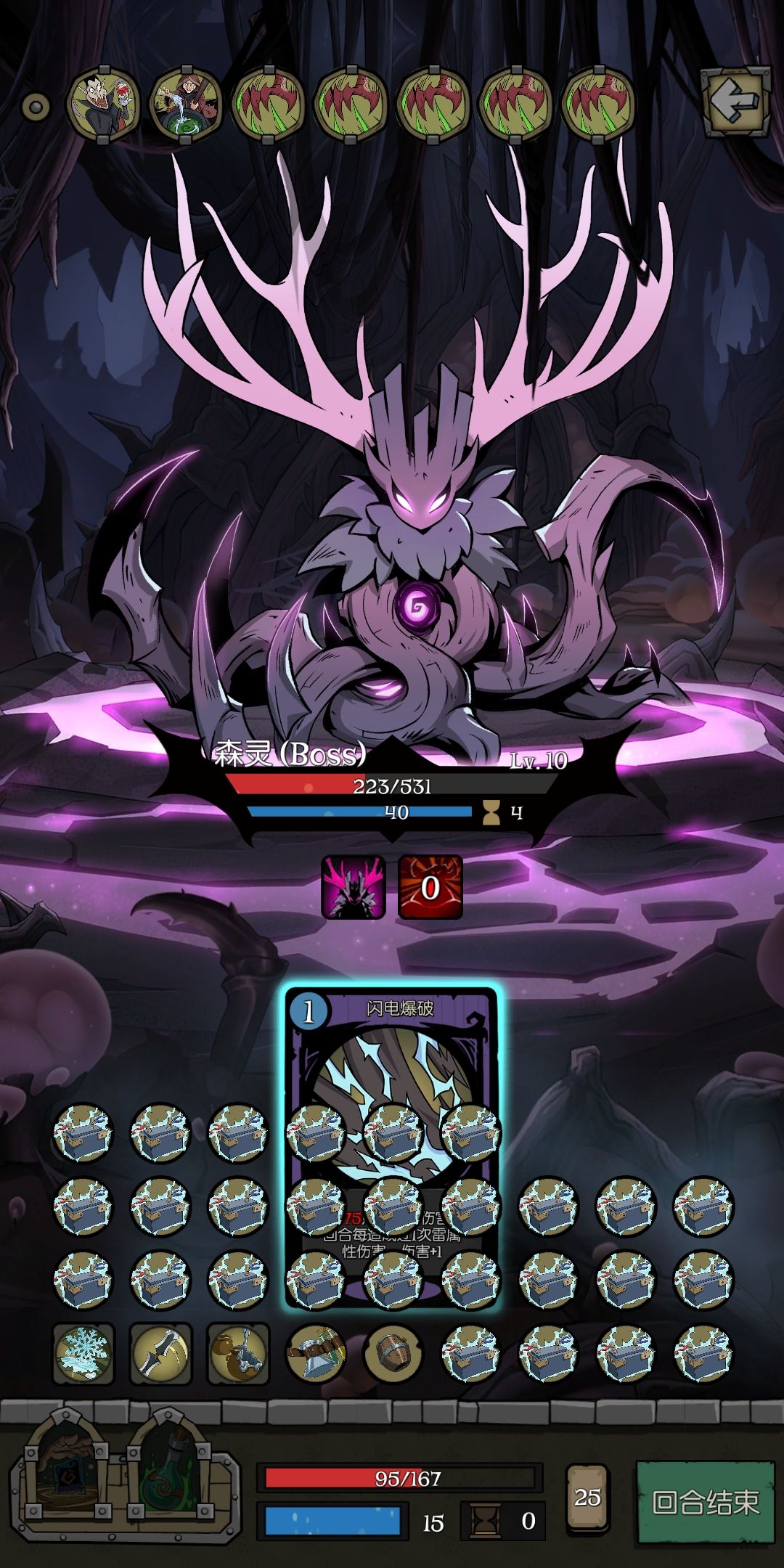 苦战,战斗号角yyds!!! 我都不知道我这个算啥流派了。有殉道流的成分,也有叠风暴攻击的成分。总之怎样伤害高怎样来。最重要的还是靠苦战复制出尽可能多的攻击牌,还有战斗号角也是核心。顺带一提,虽然正义审判在打森灵时没用到,但是打前面几个怪时真的很爽,用来补伤害太舒服了。 其实我这次打的伤害溢出了很多,而且也没有打好,有很多牌没有发挥出最大的作用,没办法,牌太多了,思考起来好累,还是乱拳打上去舒服。