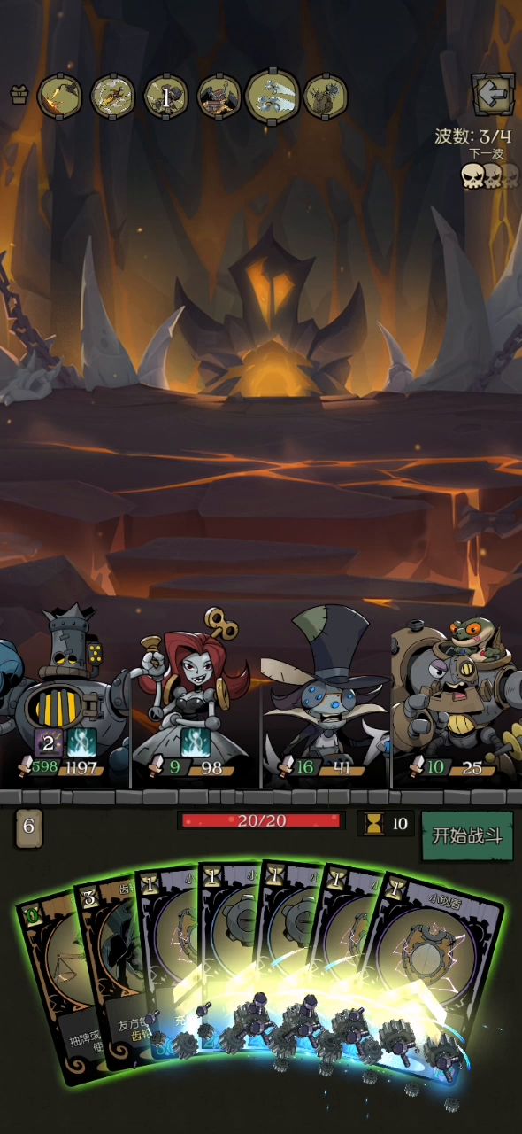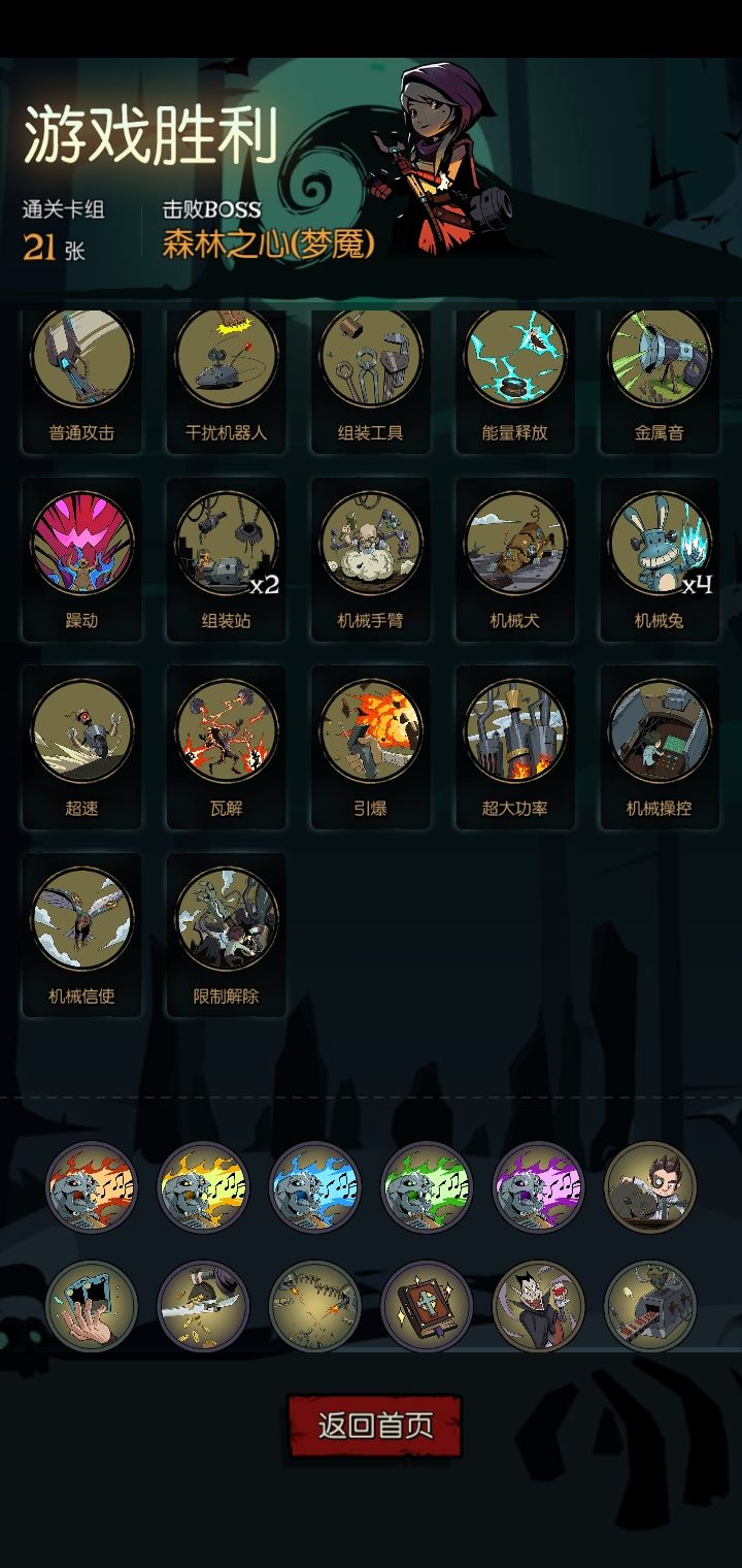 提供个思路 核心牌:转动发条+铁皮人 铁皮人:充能只需2点行动力,充能后加生命、攻击,可保证生存。 转动发条:简而言之就是正常消耗当前回合的全部行动力,下回合再额外提供消耗的行动力(如:第一回合4点,第二回合8点,第三回合12点) 把其他牌组里的牌删了,只留《小炸弹》。这样可以保证每回合都能使用《转动发条》,并且下回合能抽到《转动发条》。 伤害不足的情况下,可以带一些充能的装备牌打伤害。 实战见下