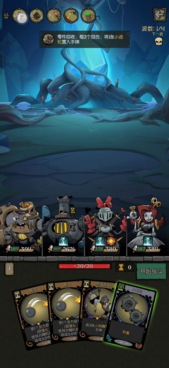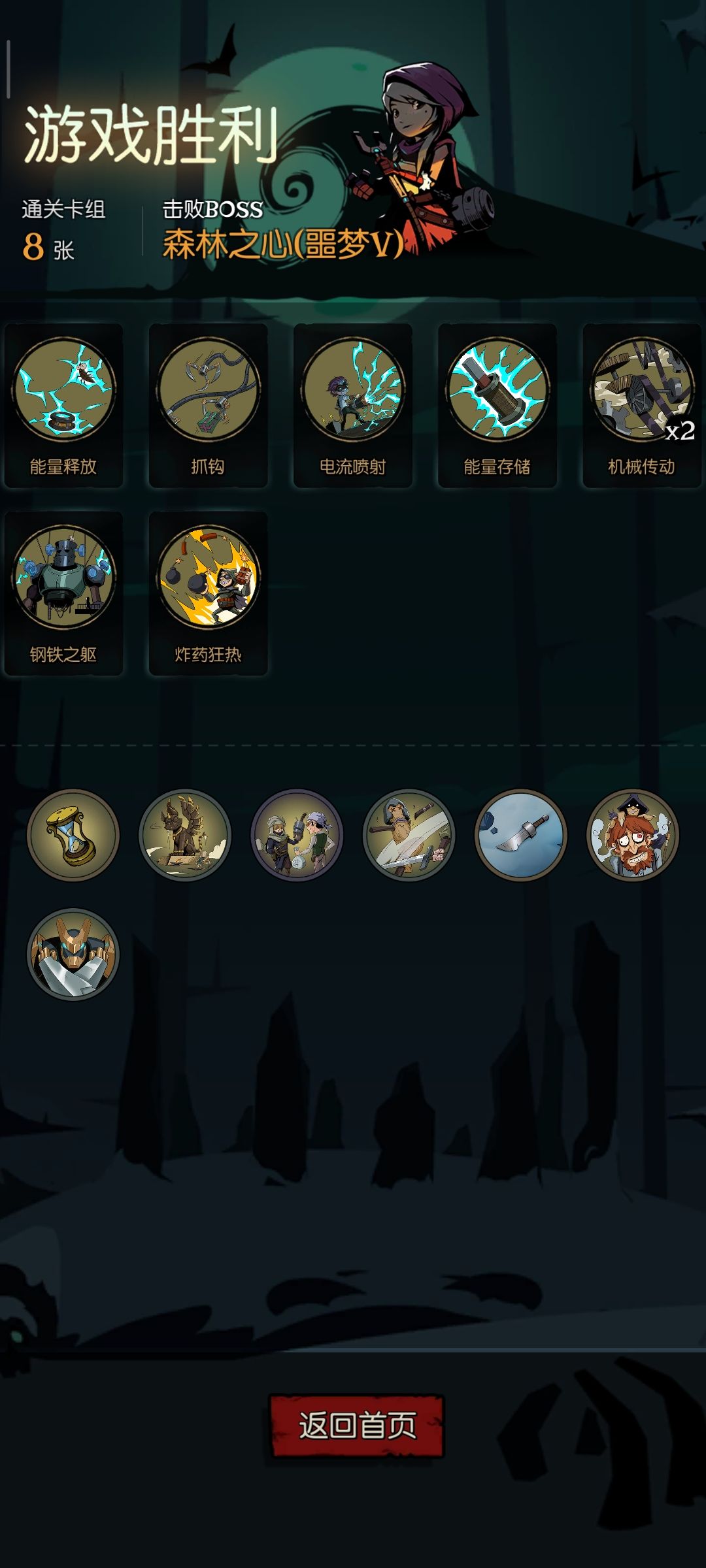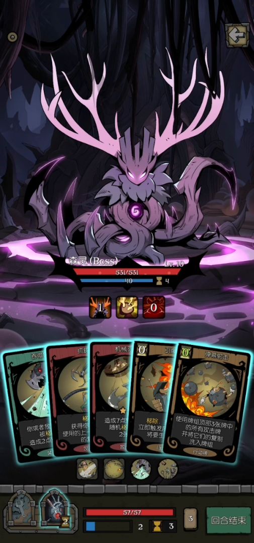 核心牌就弹幕射击、抓钩、能量释放,因为开局摸三张,boss战额外摸一张,卡组最好7张牌。 这流派太吃牌序了,所以不敢开乐章,因为会锁牌序没法重开(或者你多带点装备,一件一件换也能改牌序,折磨😂)。 必须弹幕射击上手,能量释放和抓钩在卡组里才能循环,没循环起来就是无限重开。(这把运气还行,森灵没把我抓钩变没了,不然就又得重开了。) 打到最后都还有400多金币,可以多带点装备,组装工具最好带一个,卡组