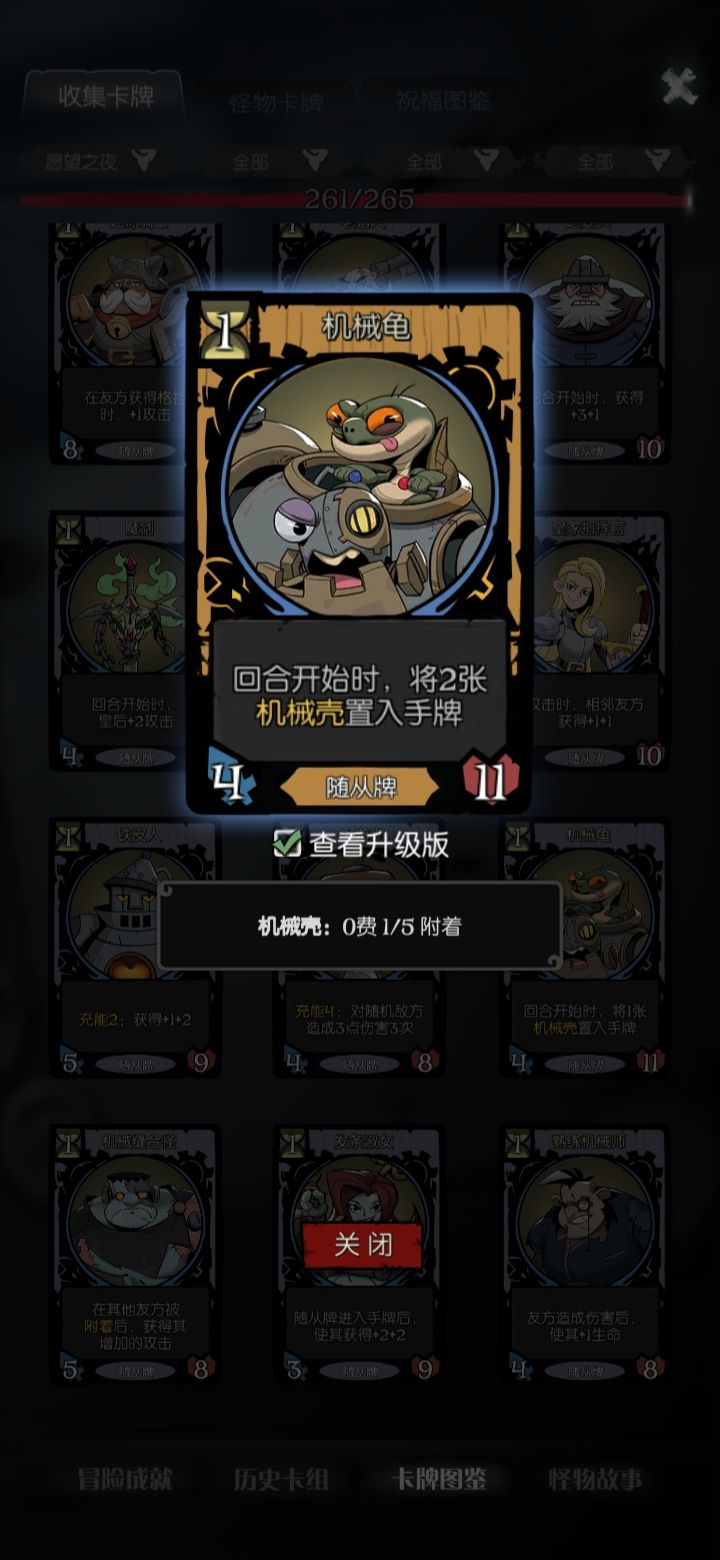 养龟流 核心随从: 机械龟 蓝色的,开局就能刷出来,所以说成型容易。 机械复合怪 也是蓝色的,好刷,这个是副c,攻击很高,但容易猝死,可以带点加血装。 爱心剑士 后期也能c,但是前期没有,而且和养龟差不多,所以这个流派叫养龟流。,而不是铸剑流。 金刚:不强求,有了当主c,没有龟哥剑士也很行。 齿轮绅士 行动力够的情况下拿,因为他充能给的附着排需要一点行动力。 核心装备:一切附着加属性的装备,我还没