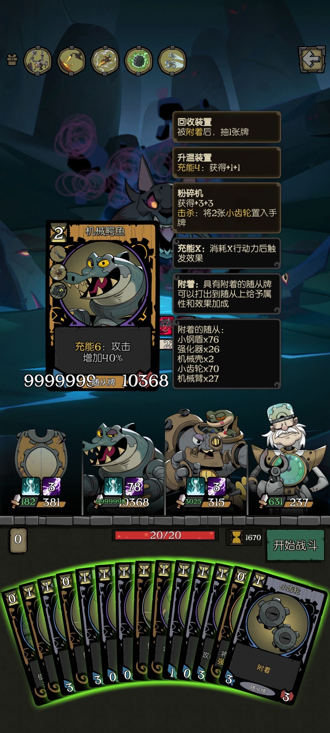 操作方法参考钻头刷钱流,有钻头的话也可以刷钱。牌组卡牌一定要少,方便回转。 核心装备:回收装置。 核心天赋:流星镖。 核心行动牌卡牌:残影,(工具箱),0费的修理 思路:随从附着给鳄鱼大哥触发装备效果抽牌,抽牌抽出0费行动牌(工具箱,修理)或残影增加行动力,行动力再用来附着鳄鱼,实现无限刷充能。 ps:按下开关 和 激发 卡牌我是前期天赋没刷到,打不过小关boss为了容错增加的。后期 激发 卡牌配