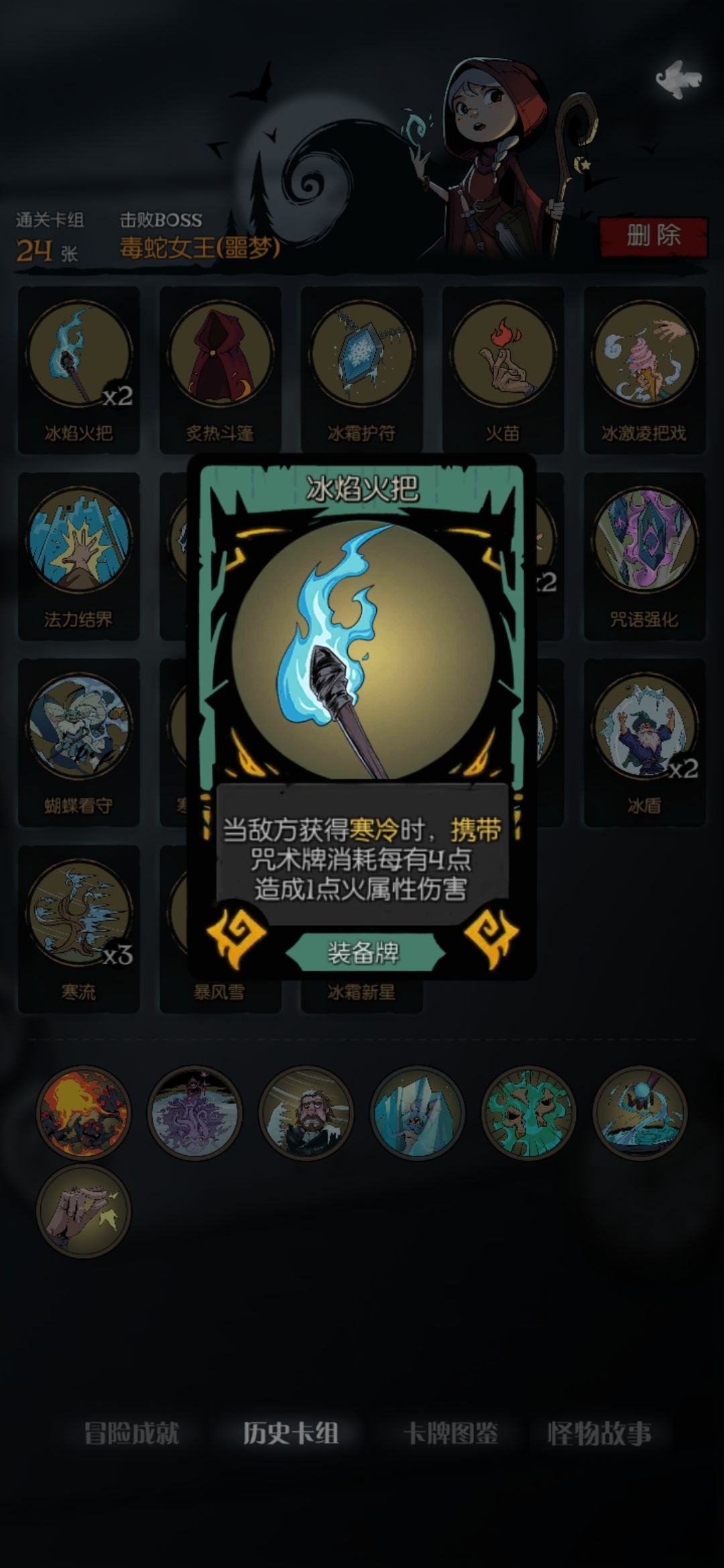 思路就是选择冰焰火把 然后把所有寒冷牌全部拿下 因为伤害是由给对面挂寒冷来打,而冰焰火把这个装备的伤害是由你携带的咒术牌消耗决定的,你的咒术牌越多伤害就越高,所以看到寒冷牌一定一张都不放过 祝福要拿到绝对零度 基本一拿到绝对零度就都是你的回合了无脑出牌就行 开局可以这样带,因为冰焰火把打的是火焰伤害,所以煤球输出占比也不错 恶魔大厨也可以换成缝合怪,多一个祝福机会