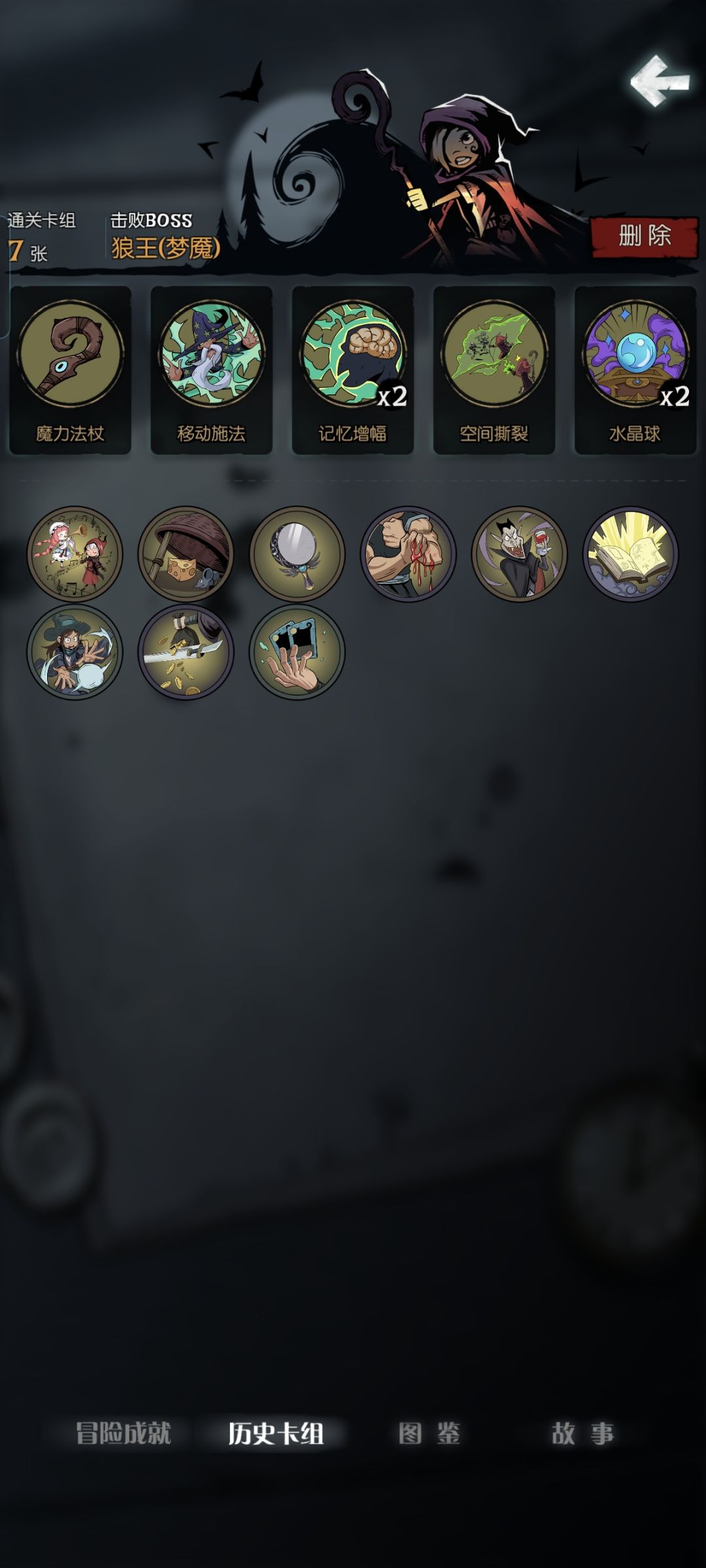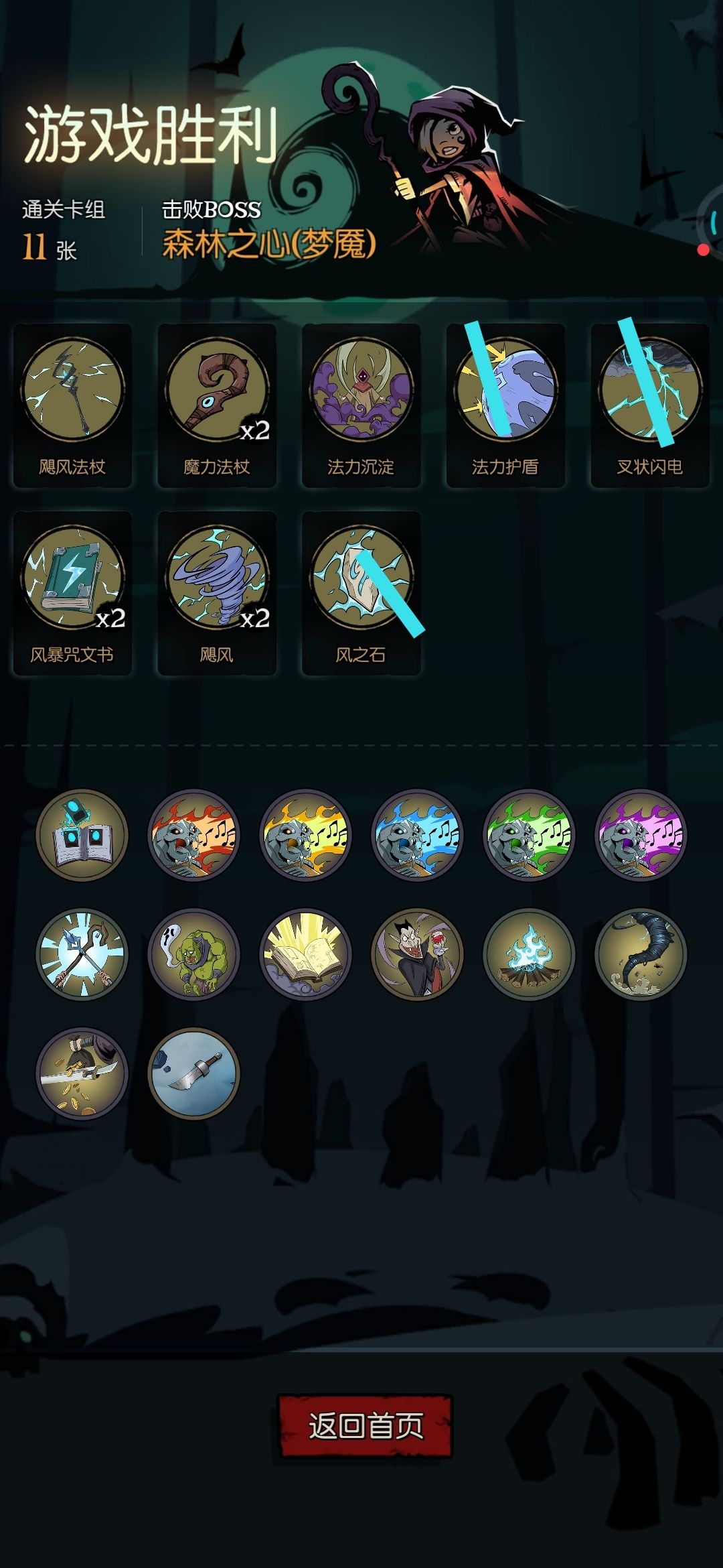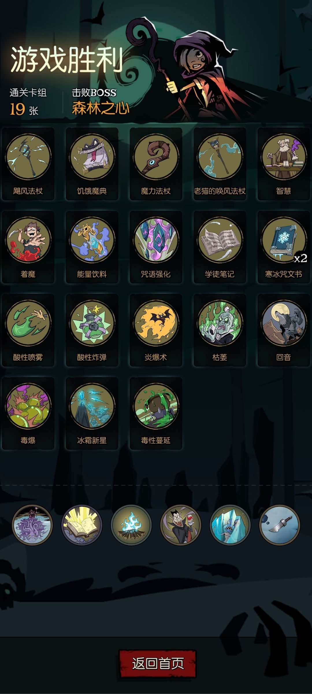 这个思路关键就是场外储存咒术牌 关键装备牌:灵感烟斗(没有扫把就搞两个),女巫扫把(附加模式的牌) 可选装备牌:法力翡翠,炙热斗篷 必要祝福:幸运星,惊奇魔典 可选祝福:诡计多端(保命用) 可能装备牌会占牌组一半 然后剩下的就搞法力牌 通关示意 如果你是想用小女巫达成极简成就 或者小女巫狼王卡关 可以试试这个流派 如果有修改建议,可以在评论区提出