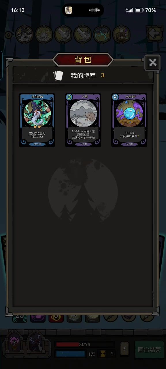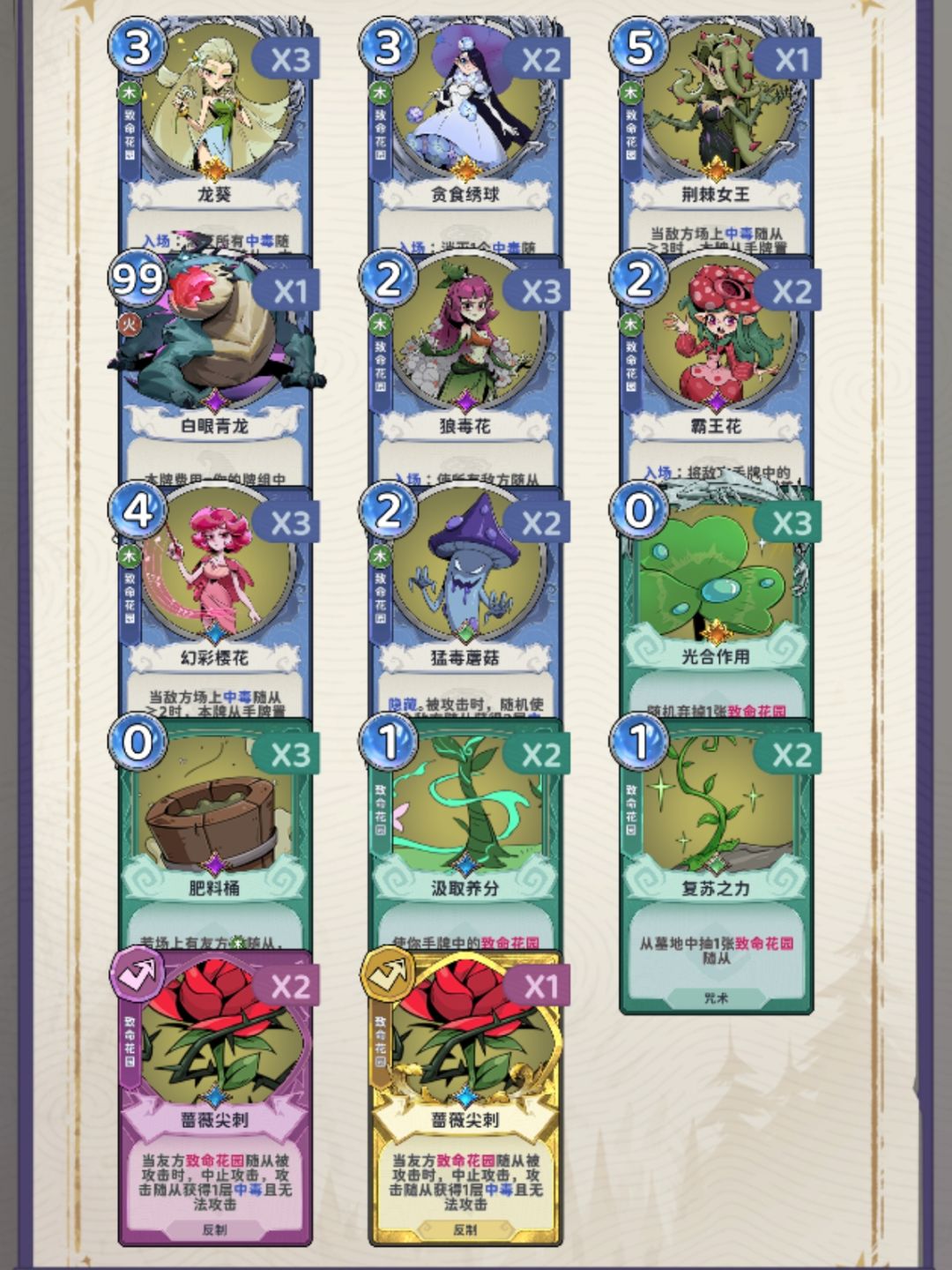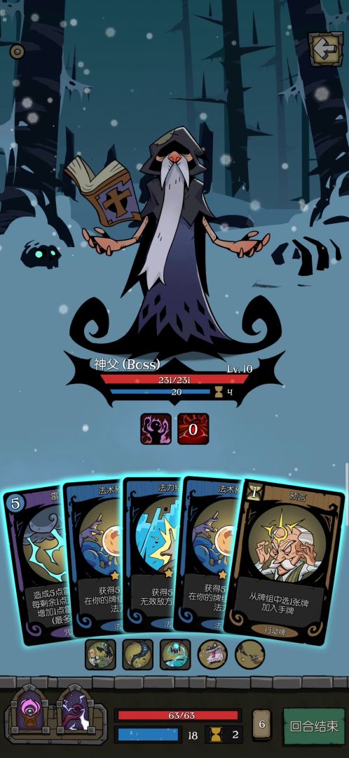 感觉还挺靠运气的,因为『绝对零度』这个祝福是前期控制关键,不然小女巫会在前期被打的很惨。 保持卡组干净可以用『咒语吞噬』,这个卡就可以帮助你在战斗时删卡,保证你每次都能摸到毒性蔓延。 『恶魔头骨』这张牌真的有时就是张神卡,因为面对『土精灵』、『丛林巨人』和『行走扑克』这些怪物的时候可以减少或免伤。 法力续航可以留着两张法力牌,或者一张『痛苦打击』一张『智慧』,这两张至少可以保证你每回合有9点的法力