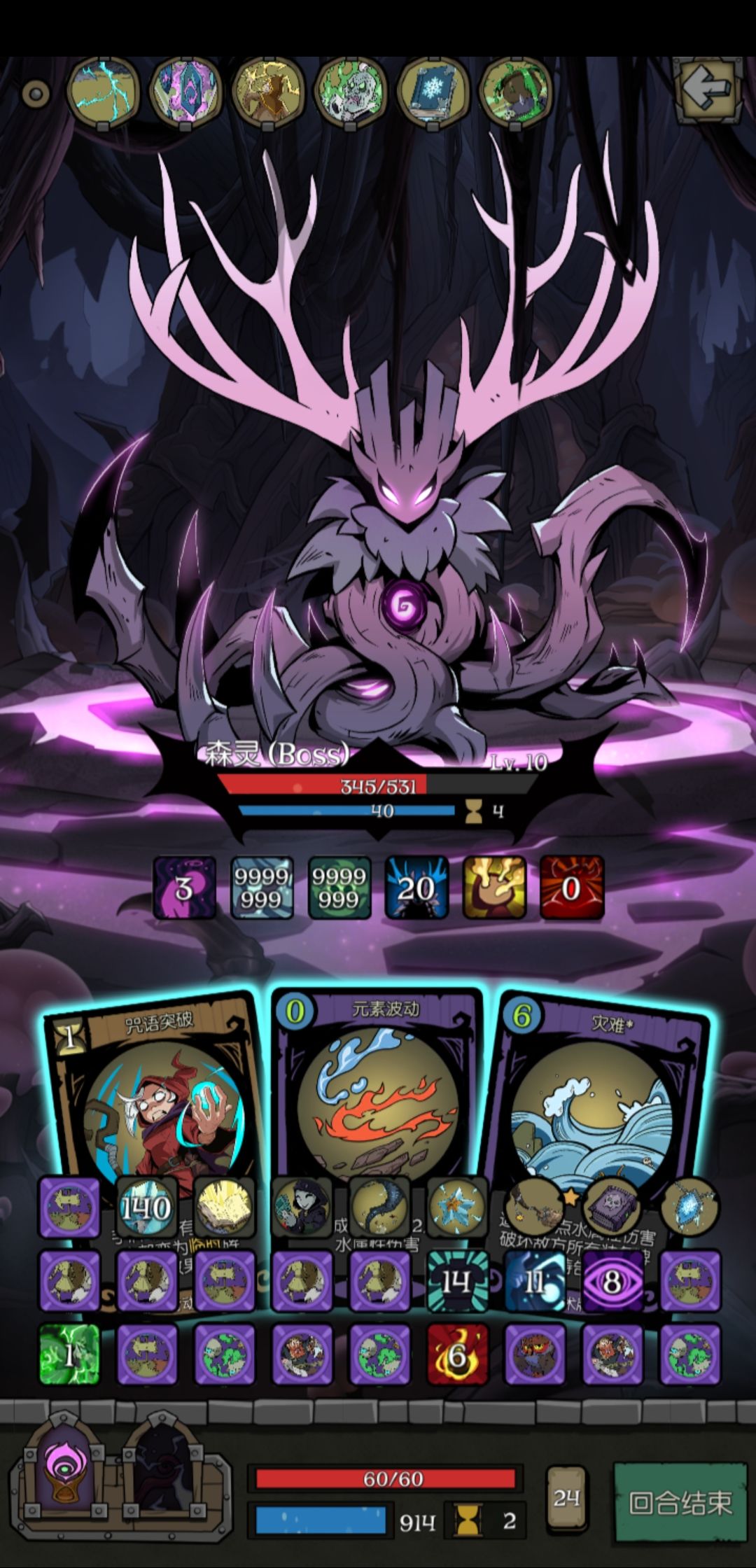 有卡牌图册天赋,初试能量差不多在40*4=160左右,而我这个视频初试能量只有21*4=84,所以需要自身的技能(伤害+3)的buff以及魔力法杖补伤害,初试能量在160左右是可以只用三个卡组在一回合秒掉森灵的,操作如视频所示。