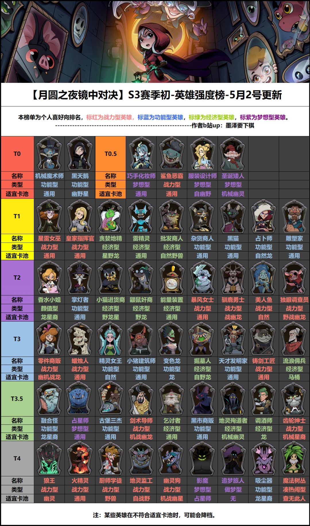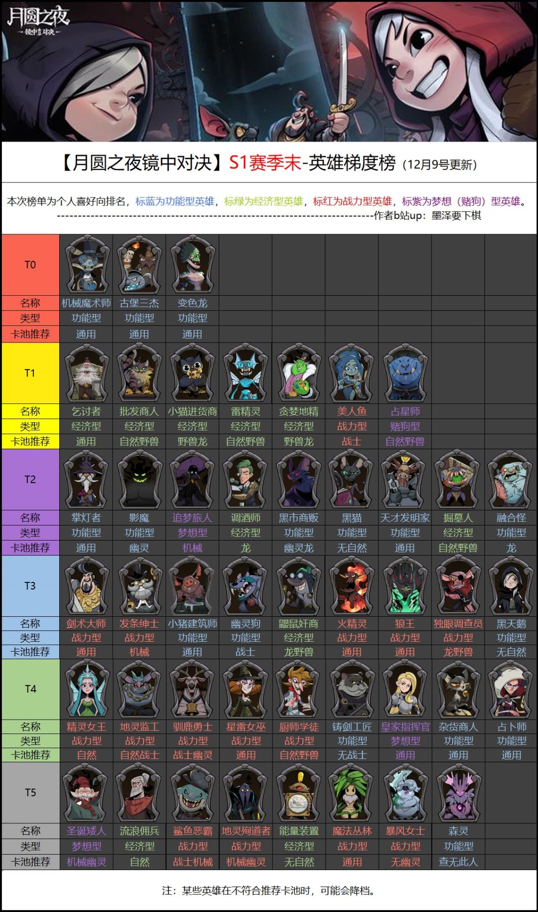 大家好我是墨泽,月圆下棋爱好者。 随着版本补丁更新,从最早的养鸟到豹鹿狂,再到花匠电表,佣兵称霸天梯,最后迎来了一个相对稳(压)定(力)的版本。 那么在此更新一下英雄梯度,以供参考。 本榜单为个人向评价,如有不同看法,可友善讨论。 我大致给英雄分为4类:功能型、经济型、战力型、梦想(赌狗)型。 详细的单个英雄点评可在12月10号本周末晚10点,来观看我的直播点评。 感谢,下期见!