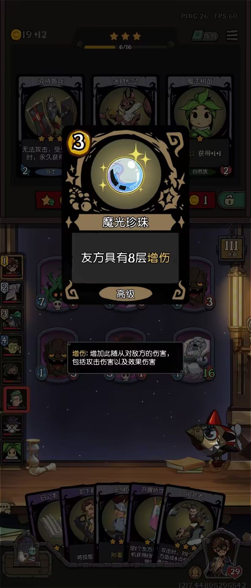 珍宝刷的好,真的是可以从头胡到脚啊,今天这一局,开始我选了一个假面,进去一看有版本之子,就期待5回合前可以偷到技能,结果真的偷到了,直接给我开启3珍宝局,因为阵容还没有想到,开始准备遗言龙,但是第一个珍宝就来了一个增伤的,我就准备来盾牌战士,这个和这个增伤的还是比较搭配的,结果后面连续出来了两个珍宝都是大胡啊,都是这个魔光珍珠,不过等级不一样,一下子就几十层的增伤出来了 我就直接丢两个挂件上去直接