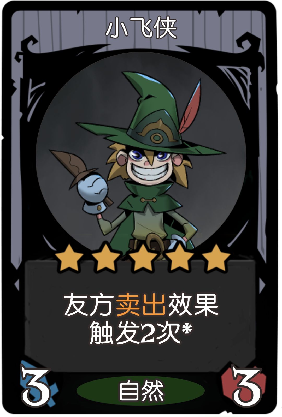 小飞侠机制解读: 相当于卖出1个物品时,再卖出1个复制。 不影响物品出售价格。 不能与英雄技能互动,只能与”卖出“效果有关的物品互动。 可以搭配buff类:【狂乱树精】、【小蘑菇】、【梦境之树】、【捕蝇草】 可以搭配资源类:【小提琴手】、【侍者】、【大厨】(给咒术)、【酩酊酒客】(给随从)、【神秘铁匠】(给装备) 可以搭配装备:【荆棘武器】(成长) 不可以搭配咒术:【拍卖会】 不可以搭配英雄:【掘