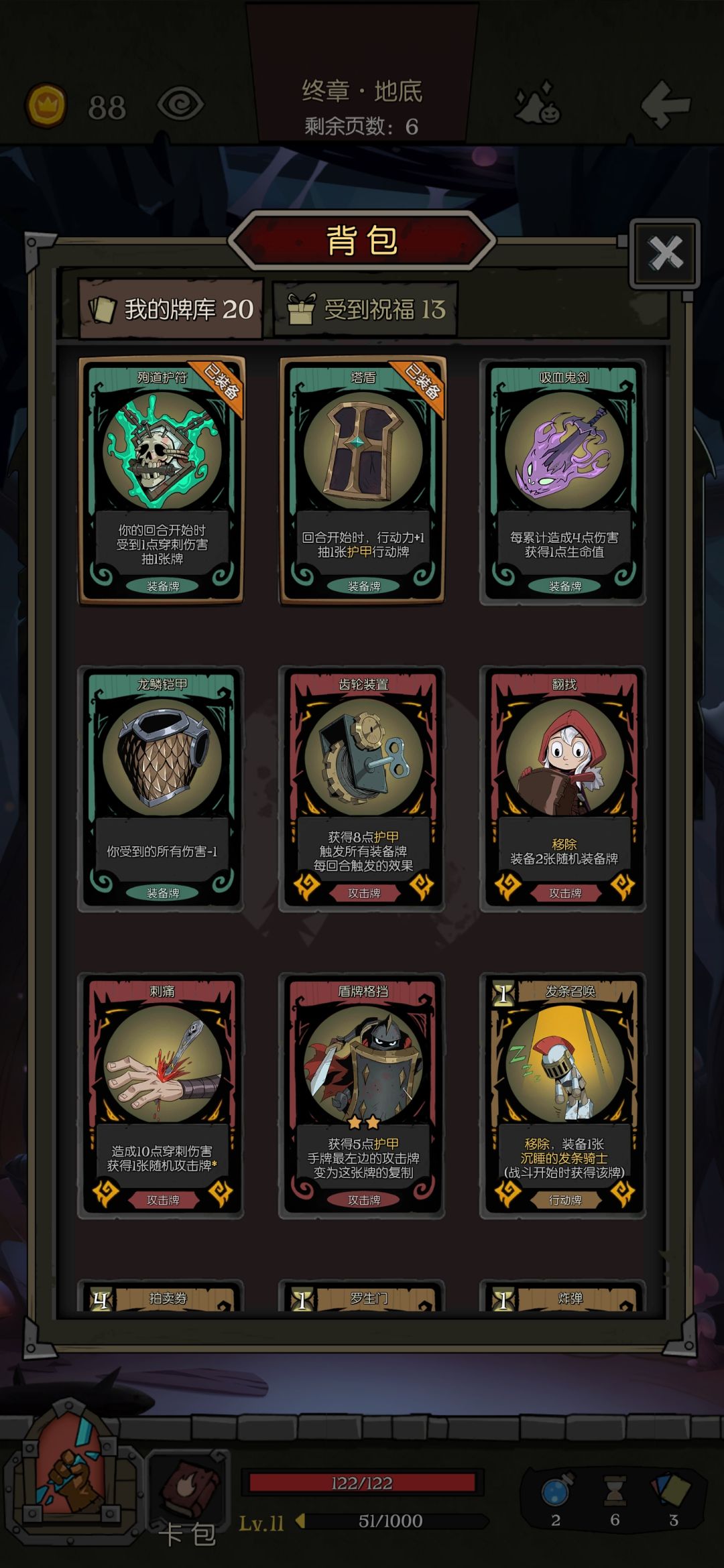 一直在摸索骑士盾刺的思路。 第一个问题是在纠结开局所有的普通攻击卡到底要不要全部删除的问题。 有尝试过普通的攻击卡全部删除,只留穿刺和复制攻击,全靠斧头打。也尝试打过一次全部留下,留着转换护甲,但是打着不舒服。 第二个问题就是,对于骑士来说,装备槽和行动力的取舍,其实比较难受。尝试过完全不考虑行动牌的思路,和完全不考虑装备的思路。实践了很多次,最终偏向了后者。 照着这个目标,验证了几次,感觉比较符