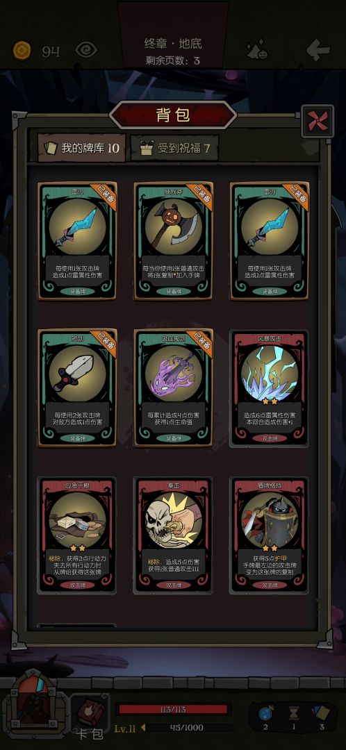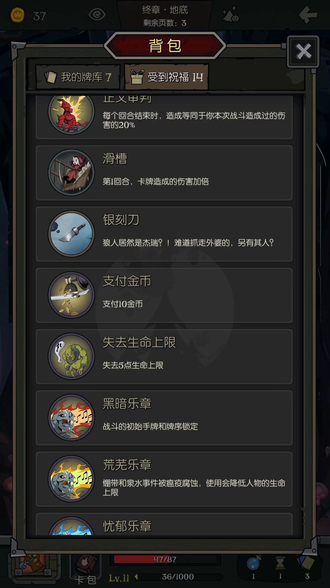 关键截图,升级选择,祝福选取等关键截图。一路到森灵。开日志(大多数玩家都有日记) 开局祝福三选一,可选可不选,正好遇到酒馆直接删2。 删牌后再拿乐章 拿上锁日记后升级殉道与拳套更配。祝福滑槽和玩具合都可以,我拿了装备合,滑槽只有第一回合嘛。 6级开乐章了必拿删牌。潘多拉遇到双头剑和猪皮背包,拿猪皮了,真香。 +7级无关键牌无装备槽无删牌拿生命也挺好了 8级又遇到装备槽,真香 卖血换钱 突击也不错 品
