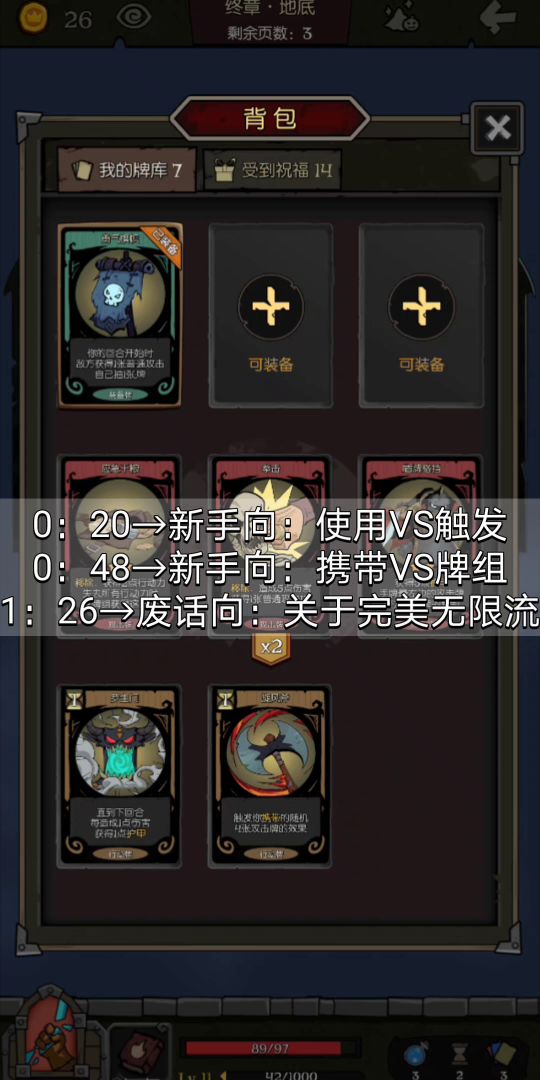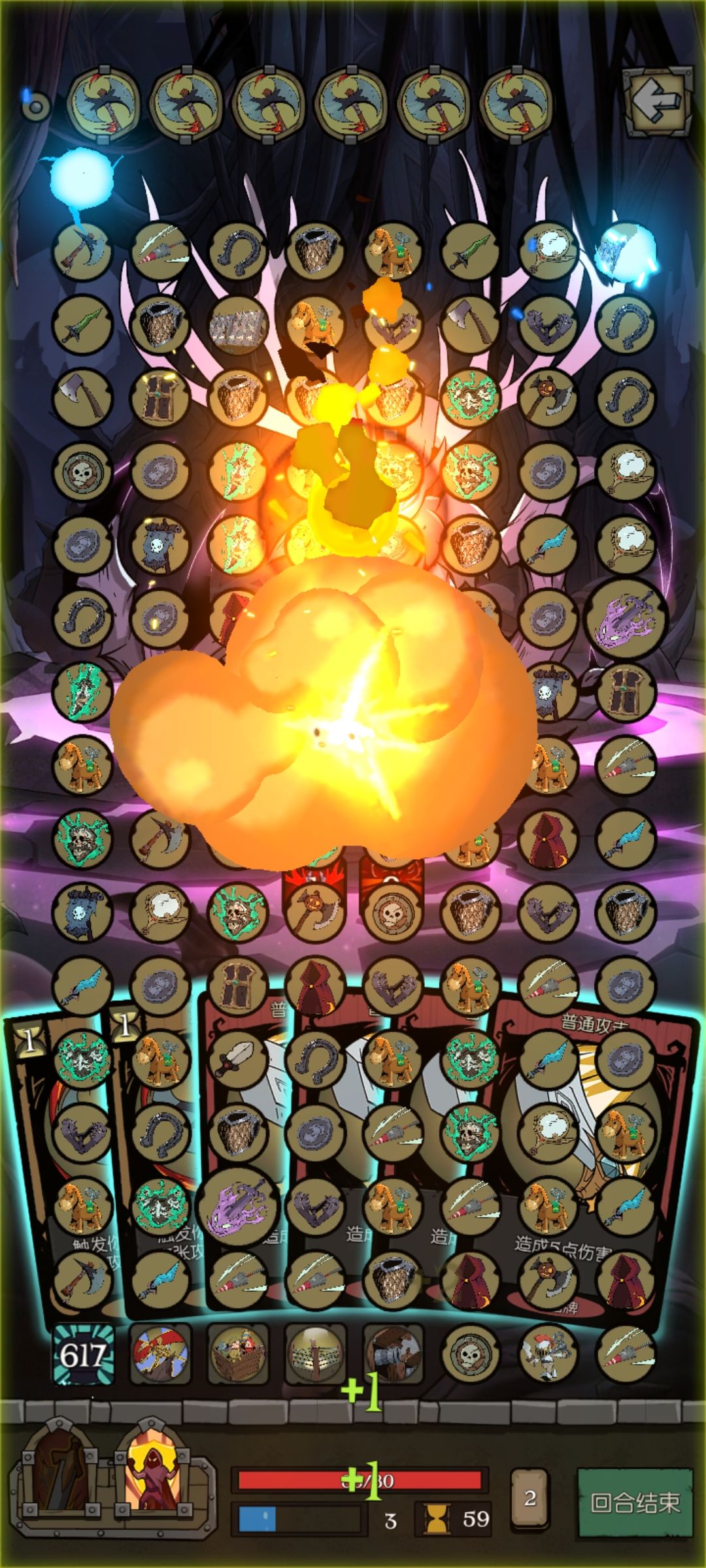 第一次发帖,有什么不对的请见谅。进入正题,之前看到大风车流派我就有个想法可不可以用相同的游戏机制刷装备,今天终于机缘巧合下成功了(如图) 个人感觉这个流派比大风车容易成型,核心牌是旋风斧,干粮,拳击,翻找。 如果你追求无限的装备,开局就不要选船载火炮了,可以选其他的,但是太麻烦我就没弄。尽量避免在商店购买不需要的牌,尽量删牌使攻击牌只有上述四张然后流派成型可以无限刷装备。 ps:这个流派纯属娱乐