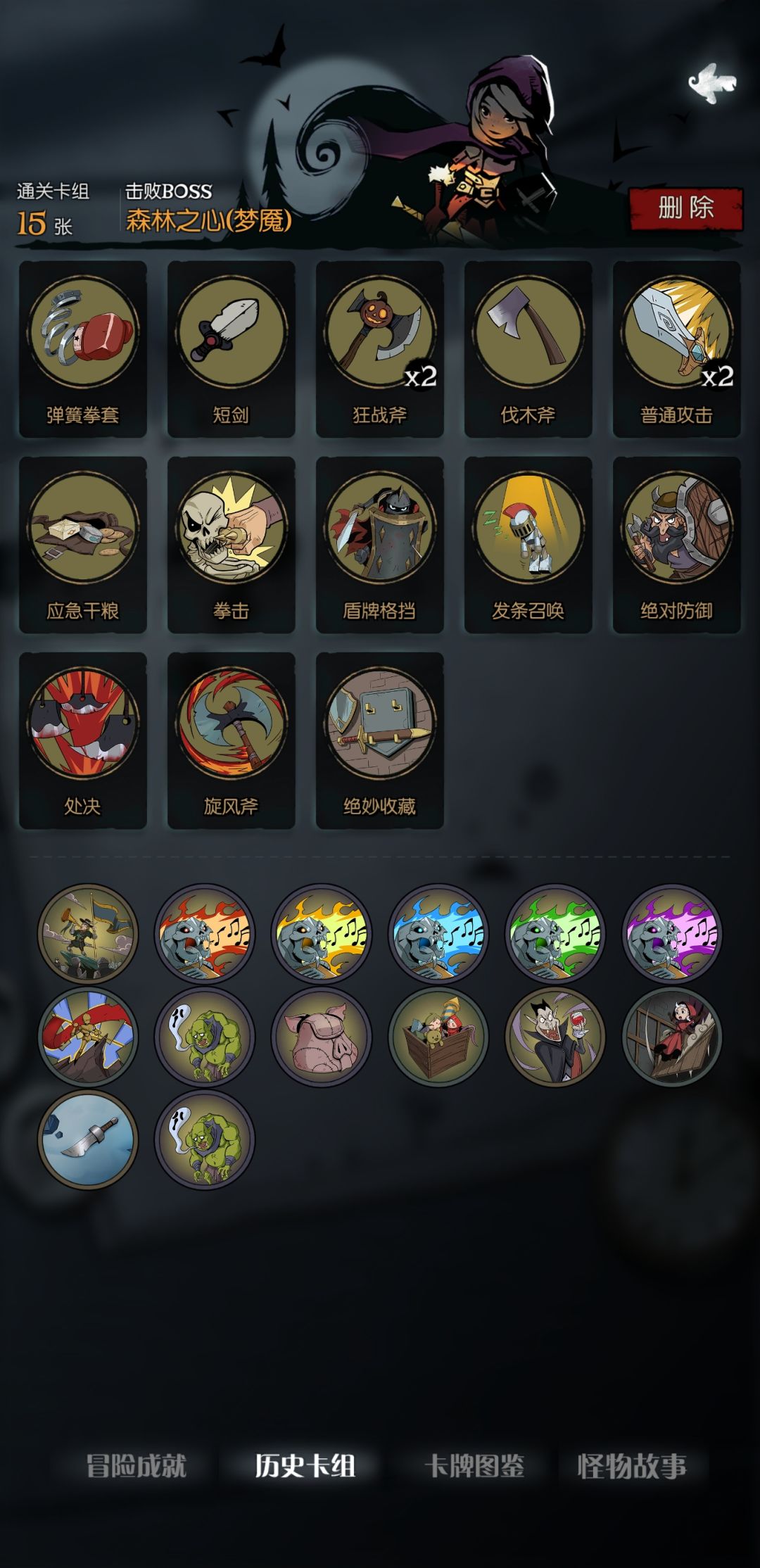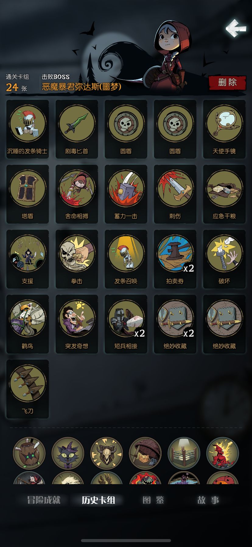 话不多说,先上图 这套卡组还行,主要是我一遍通关了,没有其他的素材,本来可以玩的更暴力的,但无奈前期太非酋了 本质就是通过圈套和殉道之剑的效果,触发多倍伤害,一刀999(我最高达到过1500多,当然不是小红帽日记那个模式,那个模式我没玩过这个套路) 另外附加一下梦魇过关截图 说实话,这五个debuff,完全不影响这个卡组,因为碰到谁都是秒,又没有反伤的怪,一个字爽,甚至感觉比打普通还简单 卡组总结
