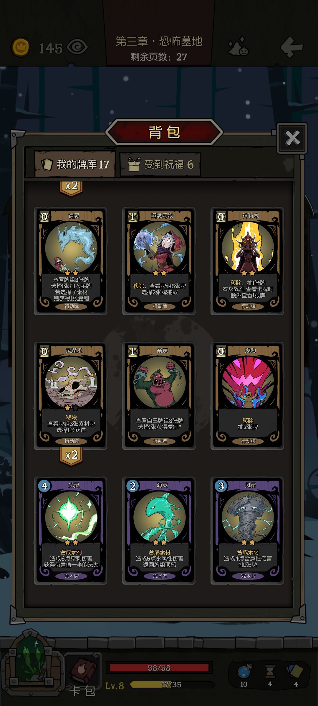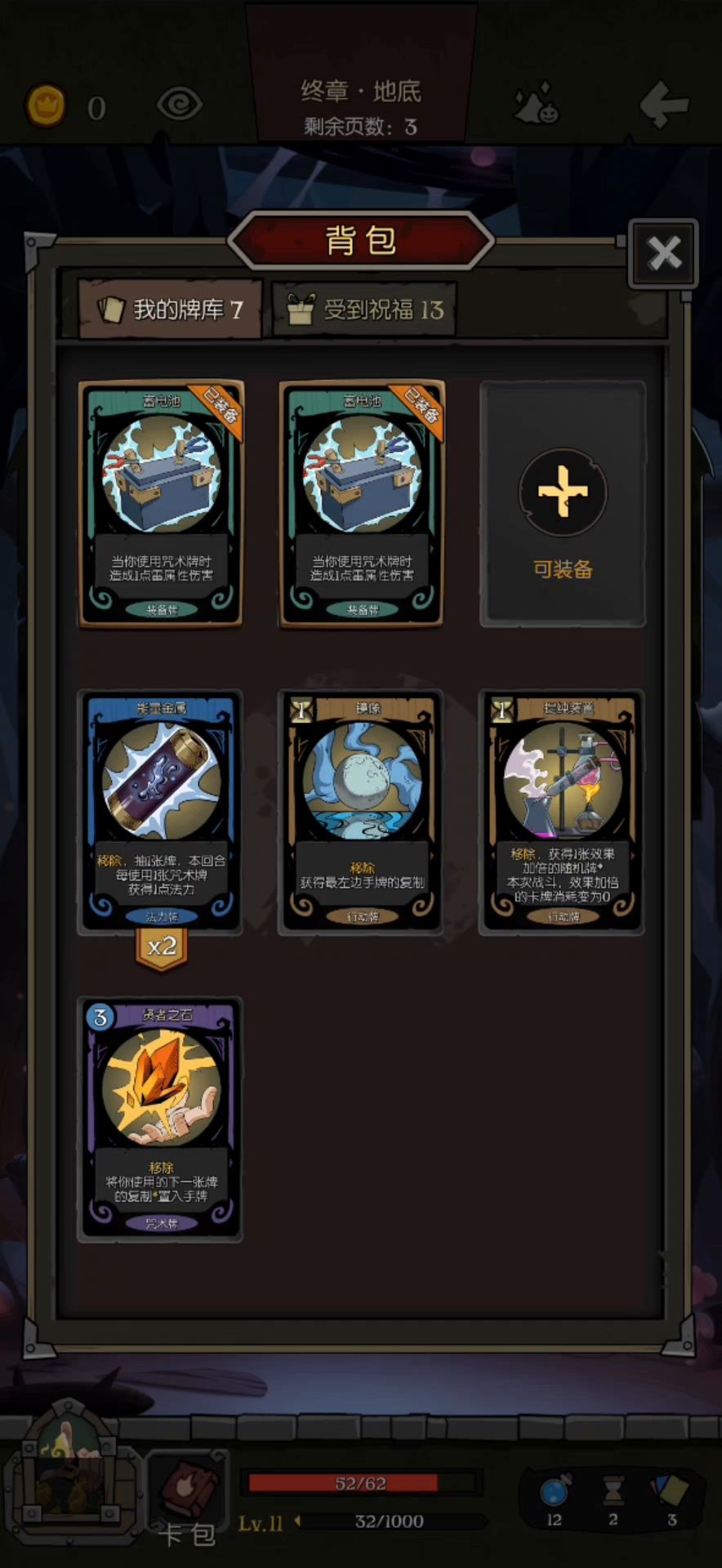 首先,先感谢官方大大以及各位小伙伴们的支持以及认可。当然也很感谢小伙伴们提出的建议和思路分析。 再次声明,因为本人并不是高玩,玩法随意,不喜欢刻意玩某种流派,分享的思路是提供给不喜欢玩流派且对于通关有一定难度的玩家的,同样,欢迎大家的指正和分享 本期是为了完善上期骑士,小女巫和药剂师使用了日记的问题,所以本次没有使用日记 首先是骑士,上一期我提到了可以玩殉道,所以起初想拿殉道的卡,但是没拿到,所以