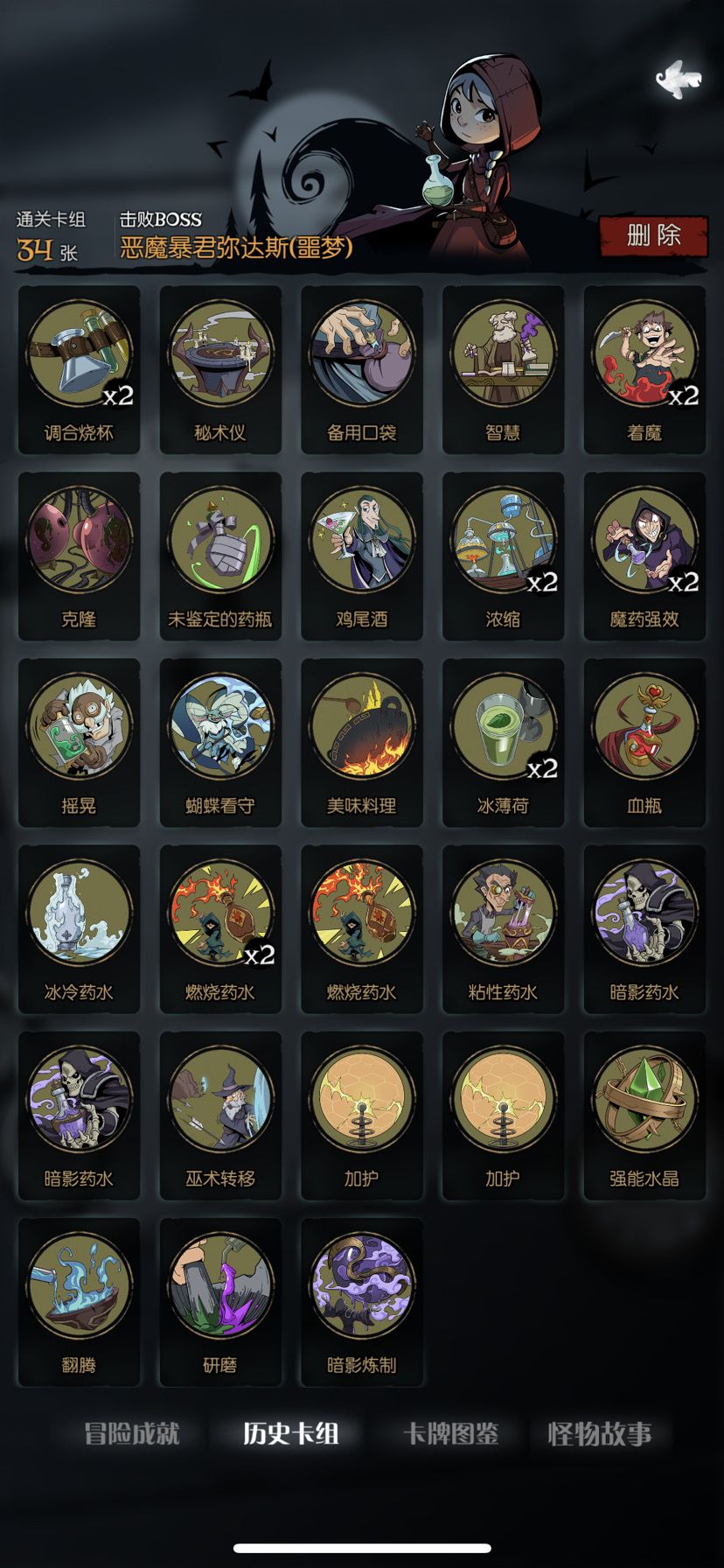 ——》前言《—— 药剂师一开始我以为是炼金术,后来发现是药瓶子,不过点金术和小石子倒是寓意了点石成金,作为后加的职业,却有修女羡慕不来的日记DLC,所以什么时候给修女补一下日记…… ——《职业特点》—— 药剂师是以药水咒术牌为核心,装备辅助输出的职业,特点是没有酒馆,因为探索技能是删卡嘛,只有在走第四章的流程时才会有酒馆。 NO.1【鸡尾酒】 ——流派简介—— 以鸡尾酒为核心输出的流派,也许你会问